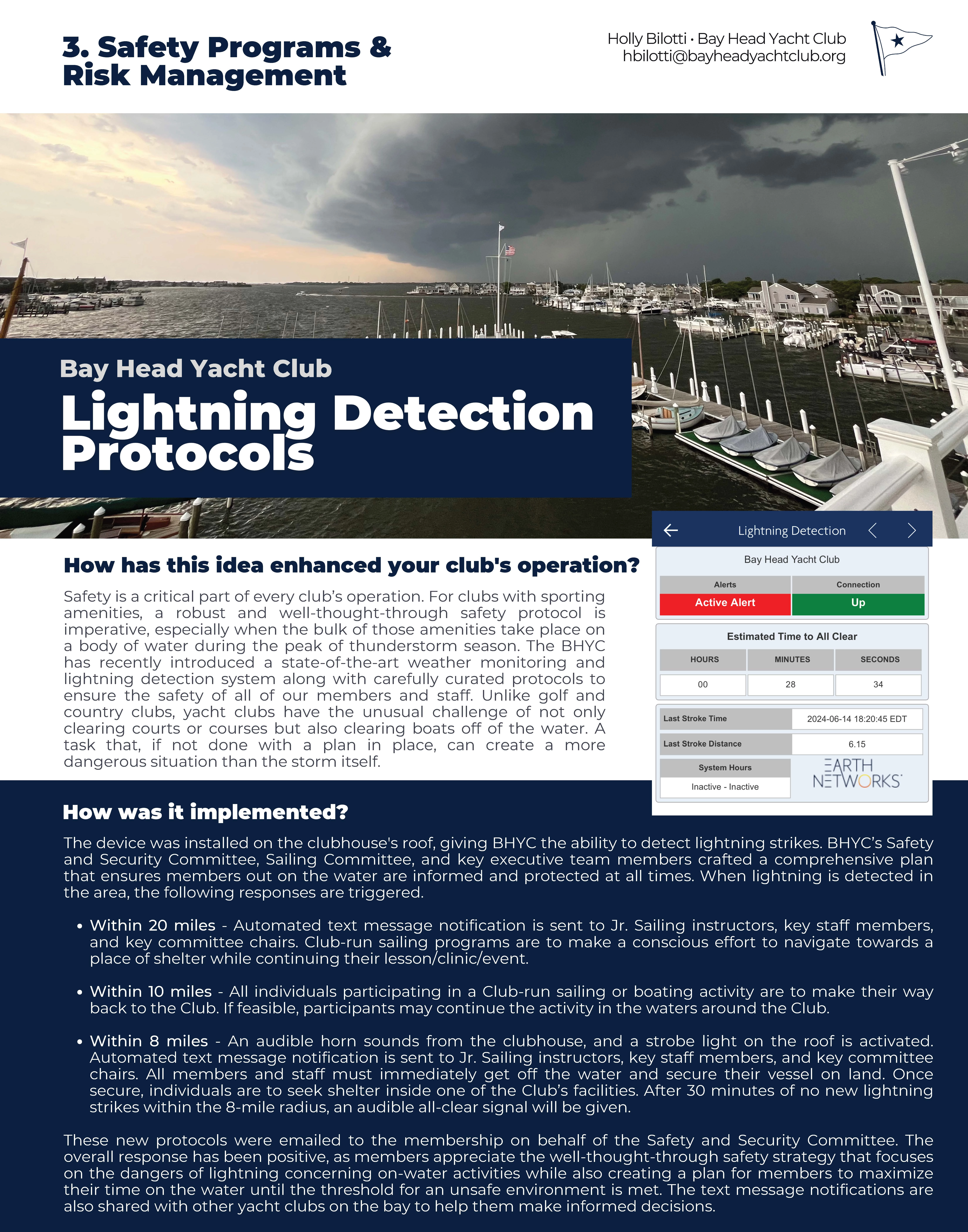 The device was installed on the clubhouse's roof, giving BHYC the ability to detect lightning strikes. BHYC’s Safety and Security Committee, Sailing Committee, and key executive team members crafted a comprehensive plan that ensures members out on the water are informed and protected at all times. When lightning is detected in the area, the following responses are triggered.