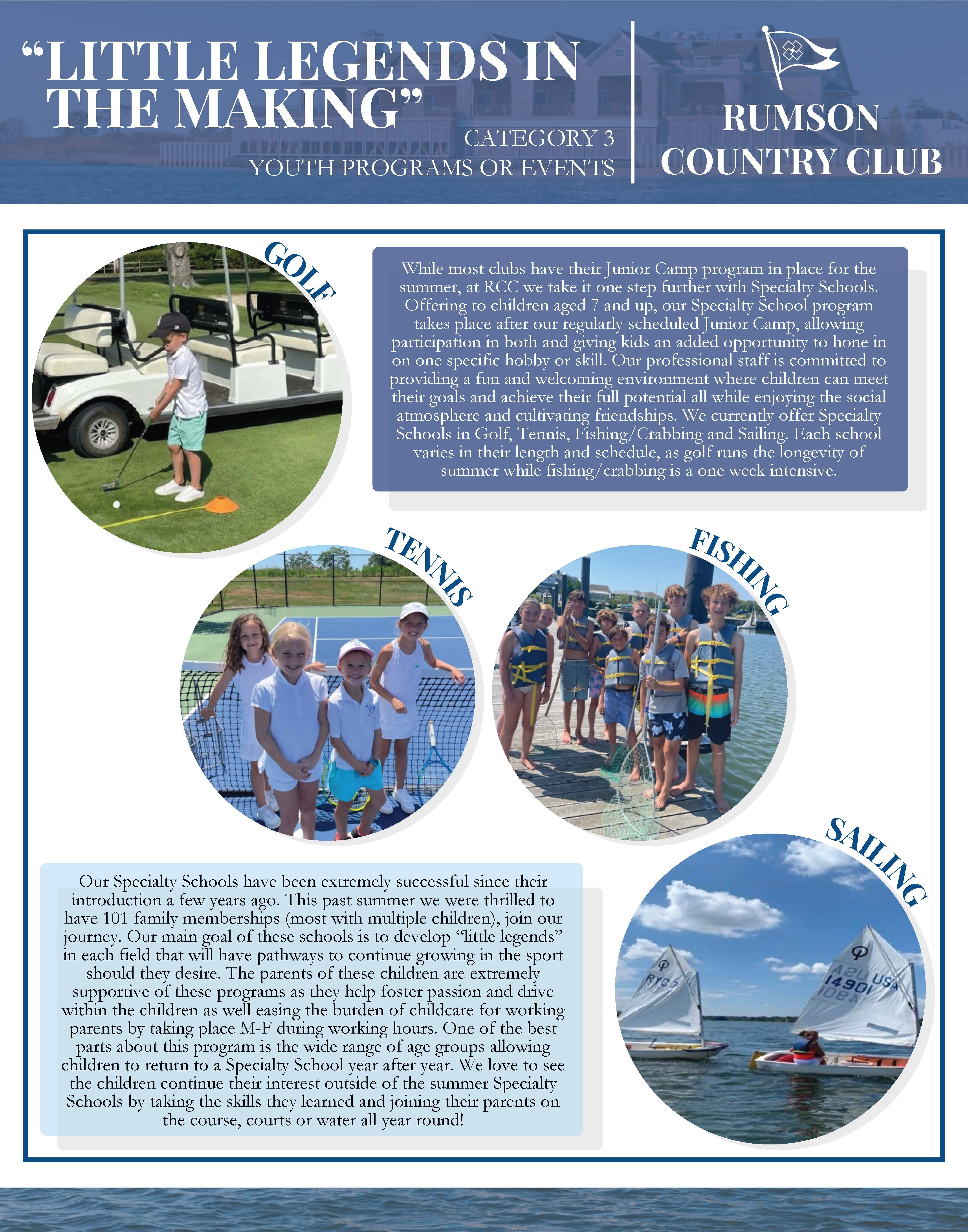 Our Specialty Schools have been extremely successful since their introduction a few years ago. This past summer we were thrilled to have 101 family memberships (most with multiple children), join our journey. Our main goal of these schools is to develop “little legends” in each field that will have pathways to continue growing in the sport should they desire. The parents of these children are extremely supportive of these programs as they help foster passion and drive within the children as well easing the burden of childcare for working parents by taking place M-F during working hours. One of the best parts about this program is the wide range of age groups allowing children to return to a Specialty School year after year. We love to see the children continue their interest outside of the summer Specialty Schools by taking the skills they learned and joining their parents on the course, courts or water all year round!