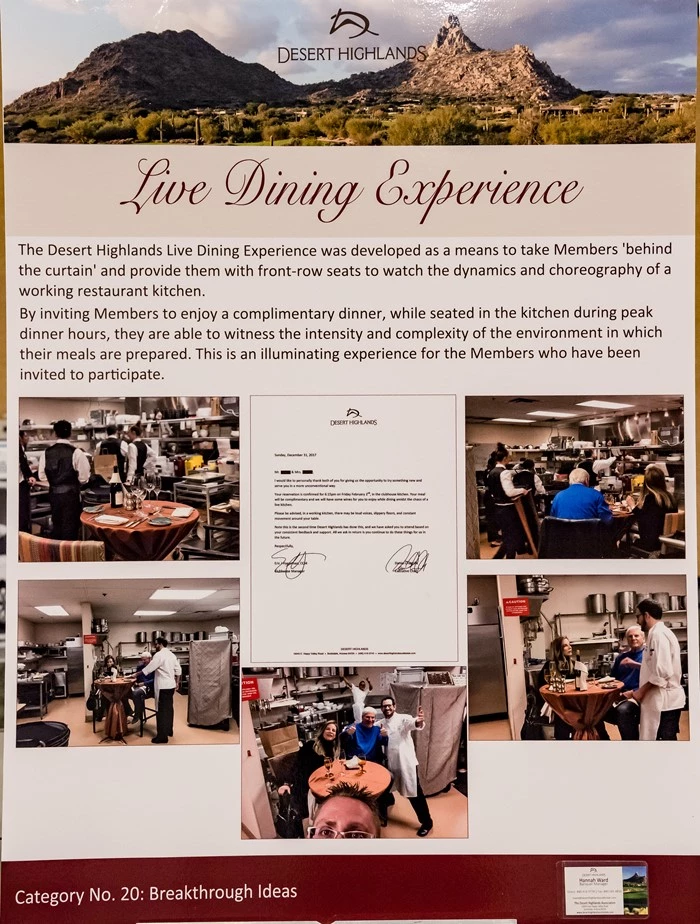 Live Dining Experience offering dinner inside the Clubhouse kitchen. We have begun offering dinner reservations by invitation only in the kitchen once a month to our more challenging members. We will continue to do this in hopes that our members will see what occurs behind the scenes on a busy Friday or Saturday night and the lengths staff go to create a fabulous dining experience for all members in the dining room. Our goal is that this new experience for members will humanize the staff in their eyes.