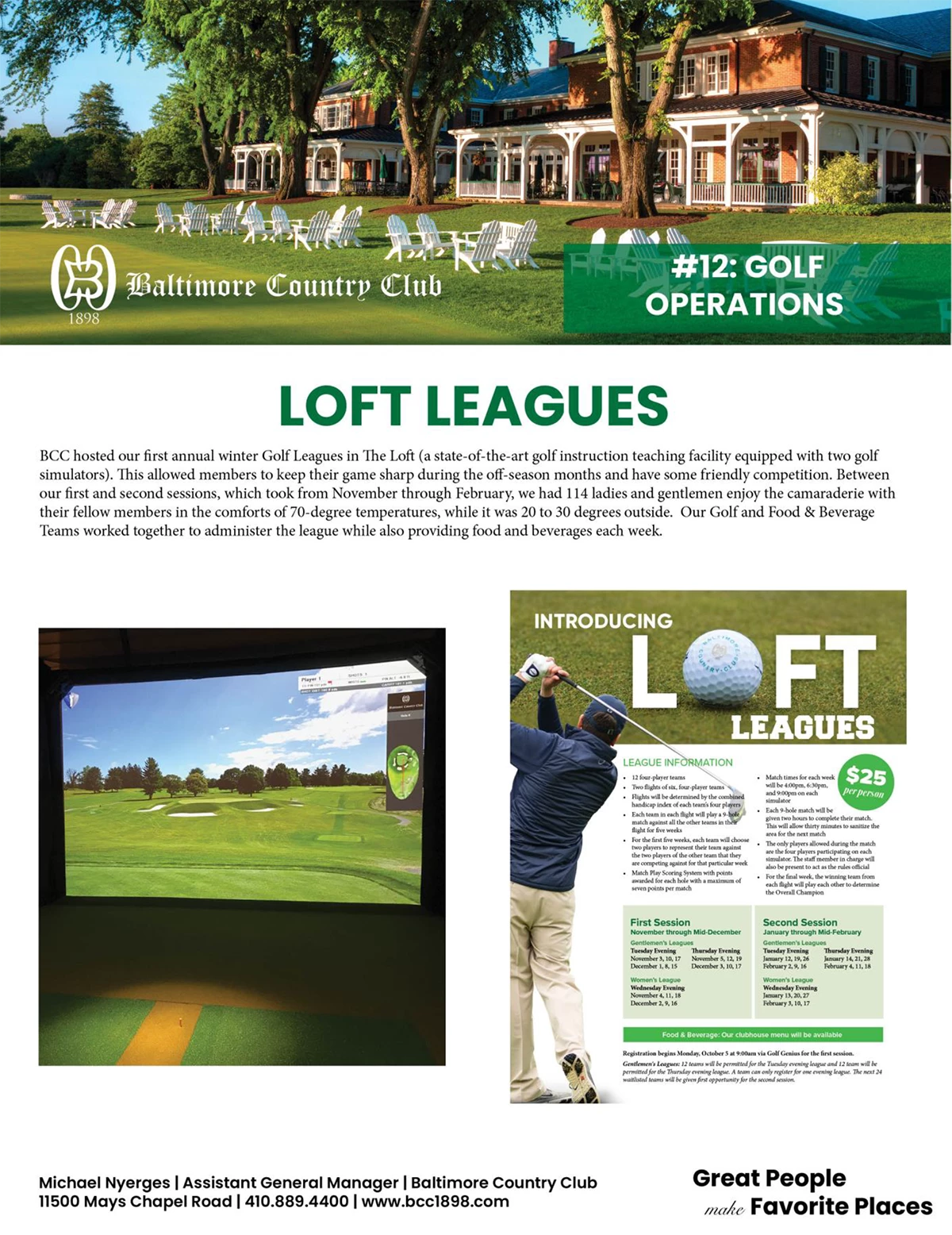 Implementation of the Loft Leagues was simple as we needed to provide an avenue for members to keep engaged with the sport of golf as well as a recreational use. Utilizing our two golf simulators and providing a social environment for members to enjoy food and beverage was a minimal investment as the space was already appropriate with furniture utilized from other outlets or storage. The leagues also provided camaraderie within the membership while increased F&B sales. Promoting the leagues, a couple months ahead, ensured we had a consistent group of members who wanted to participate and build up excitement within other members.
