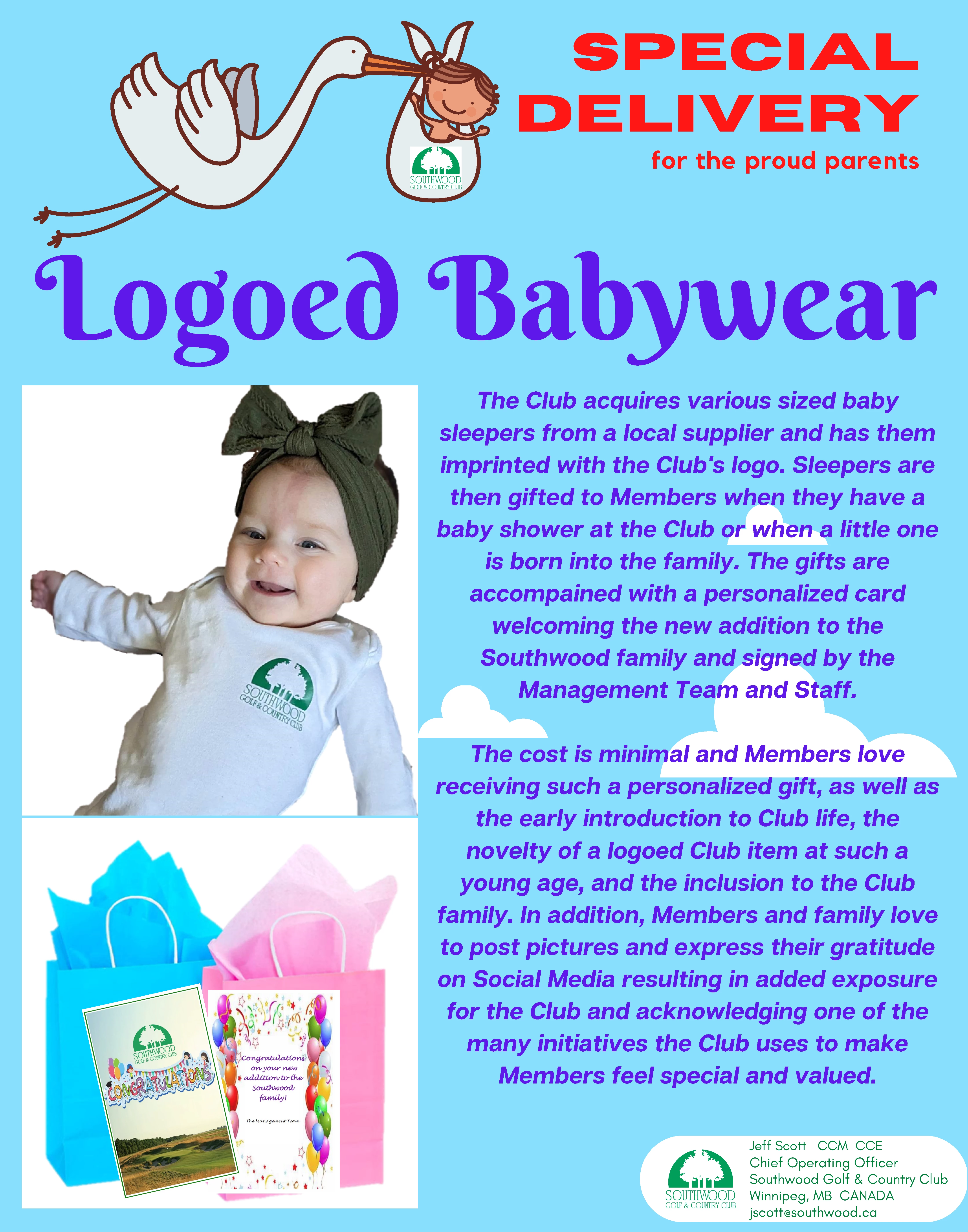 The Club acquires various sized baby sleepers from a local supplier and has them imprinted with the Club's logo. Sleepers are then gifted to Members when they have a baby shower at the Club or when a little one is born into the family. The gifts are accompained with a personalized card welcoming the new addition to the Southwood family and signed by the Management Team and Staff.