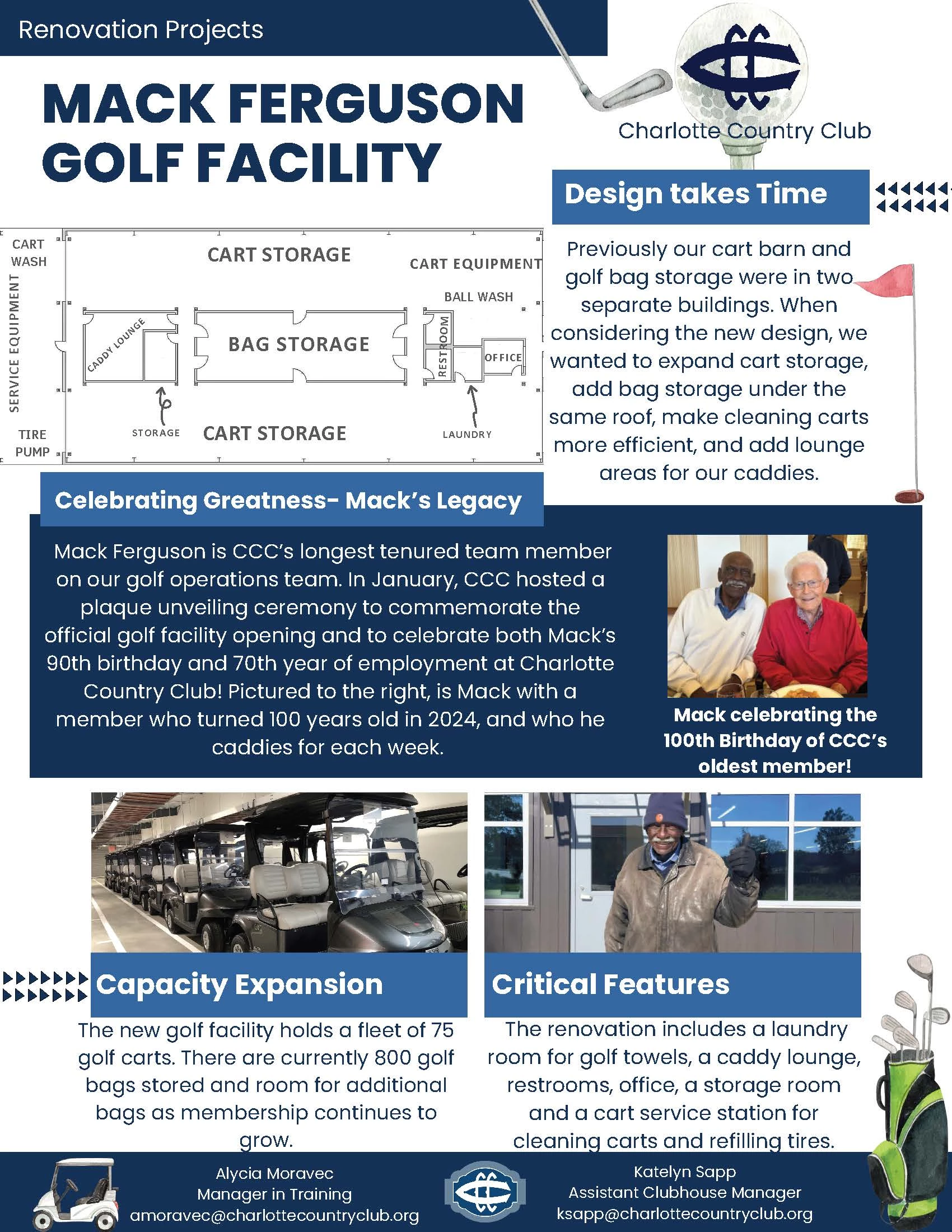 Multiple committees and the CCC board of governors planned, implemented and executed the development of the golf facility renovation. The previous cart barn was located beside the first fairway, so post-demolition members now have an open view of the entire front nine when teeing off on the first hole. The new golf facility was announced to our members to honor our longest tenured teammate in Charlotte Country Club history, Mack Ferguson. Mack is currently on the golf operations team and celebrated his 70th anniversary at CCC on January 1st, 2025. Many members grew up with Mack and have known him for their whole lives. On January 17th we commemorated the opening of the facility with a plaque unveiling and a celebration of Mack’s amazing milestones- including his 90th birthday!