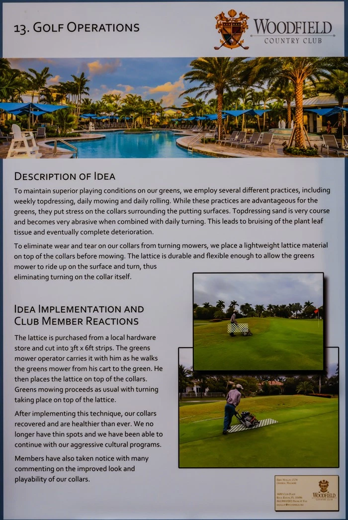 The lattice is purchased from a local hardware store and cut into 3ft x 6ft strips. The greens mower operator carries it with him as he walks the greens mower from his cart to the green. He then places the lattice on top of the collars. Greens mowing proceeds as usual with turning taking place on top of the lattice.