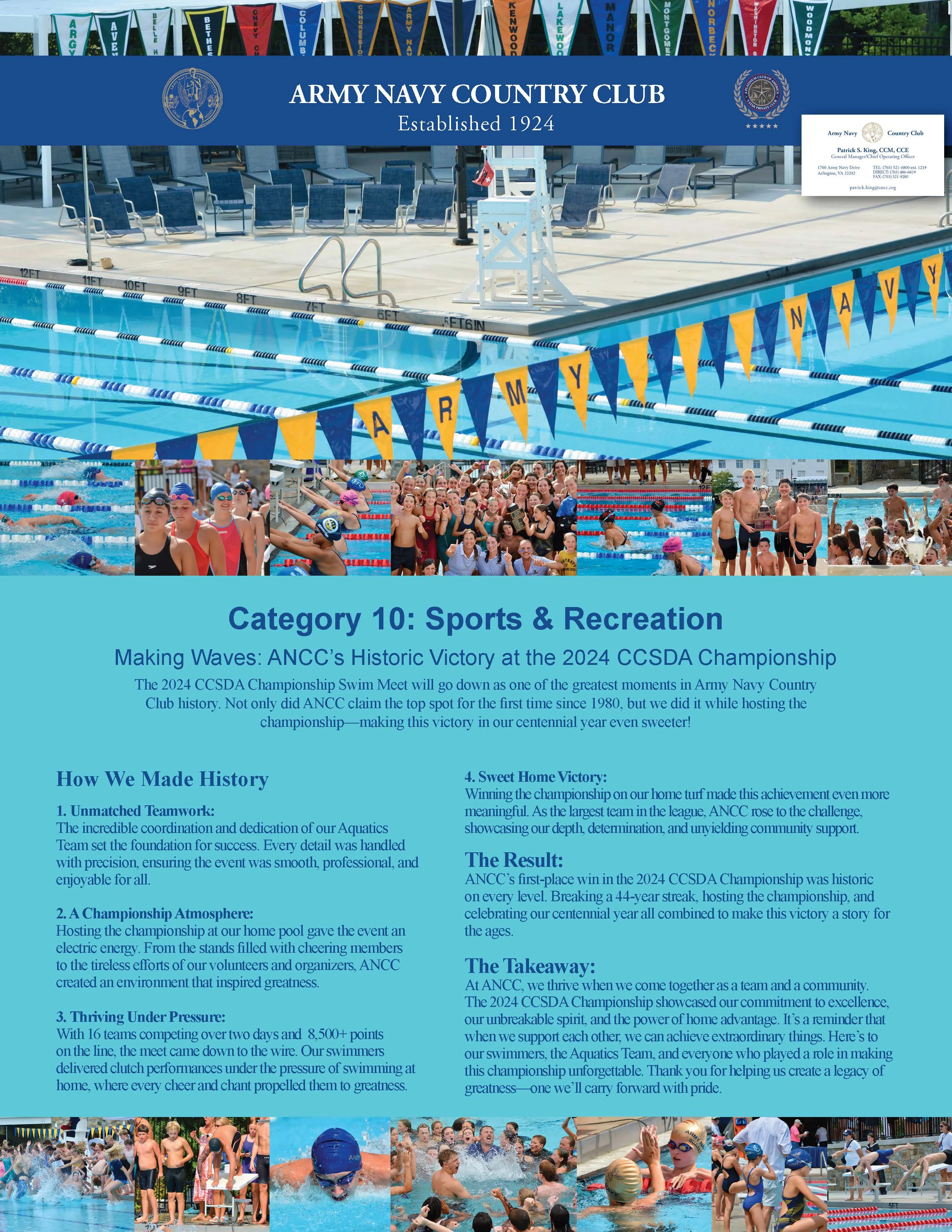 Hosting and winning the 2024 CCSDA Championship Swim Meet has significantly enhanced Army Navy Country Club’s reputation and community spirit. Successfully managing such a large-scale event showcased ANCC’s ability to execute prestigious competitions with professionalism and flair. The victory on our home turf energized the entire club, uniting members, staff, and athletes in celebration. This achievement also strengthened team morale, reinforcing a culture of dedication and excellence that extends beyond the pool. The event highlighted ANCC as a premier venue for hosting elite competitions, enhancing our standing within the league and beyond.