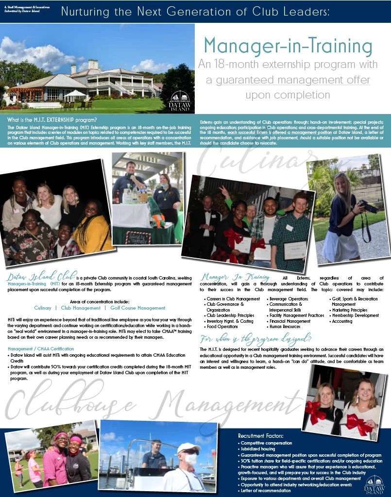 The M.I.T. Externship Program is designed for recent graduates seeking to advance their careers through an educational opportunity in a Club management training environment. Dataw Island has now had two "classes" of Manager-In-Training (M.I.T.) Externs, comprising ten recent college graduates who studied Hospitality, Culinary Arts, or similarly-related fields. They spend 18 months working in the Club and doing rotations throughout various departments to learn many facets of Club management.