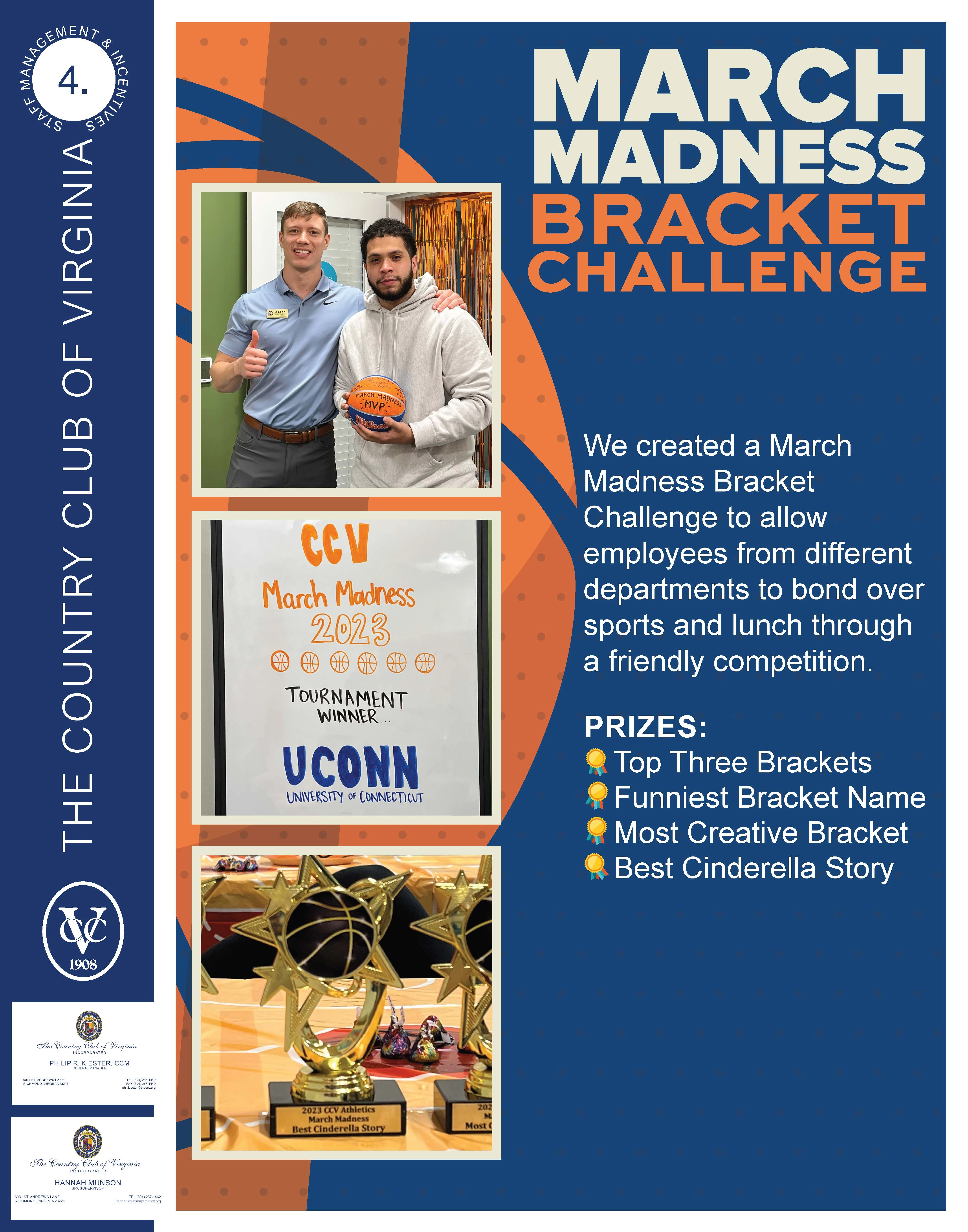 Employees were invited to participate via email, with instructions on how to download and complete their bracket prior to the start of the NCAA Men's Basketball Championship Tournament. Everyone enjoyed the friendly competition, and special prizes were awards at a final luncheon and awards ceremony for the top three brackets, the funniest bracket name, the most creative bracket, and the best Cinderella story. The idea allowed for communication, comradery, and friendly competition between different areas that otherwise don’t get much chance to interact.