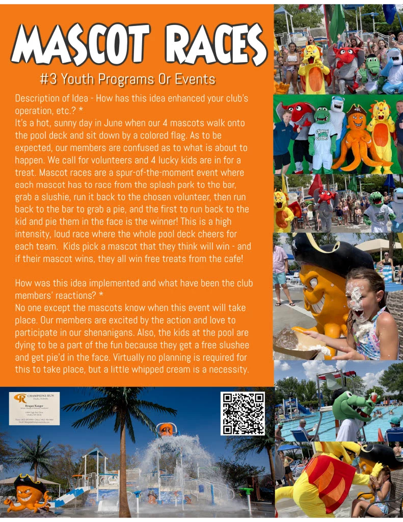 It’s a hot, sunny day in June when our 4 mascots walk onto the pool deck and sit down by a colored flag. As to be expected, our members are confused as to what is about to happen. We call for volunteers and 4 lucky kids are in for a treat. Mascot races are a spur-of-the-moment event where each mascot has to race from the splash park to the bar, grab a slushie, run it back to the chosen volunteer, then run back to the bar to grab a pie, and the first to run back to the kid and pie them in the face is the winner - FOR EVERYONE WHO CHOSE THAT MASCOT TO WIN! This is a high intensity, loud race where the whole pool deck cheers for each team.