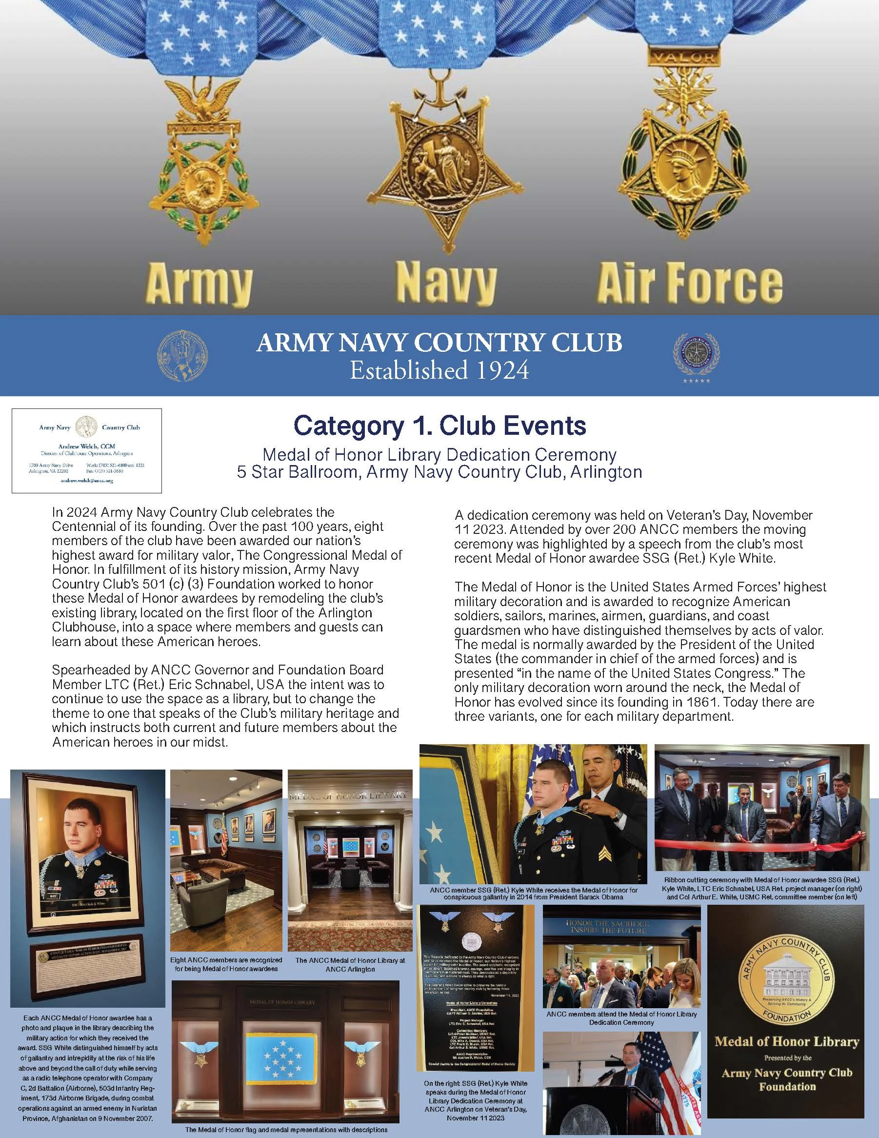 A sub-committee comprising both retired and active duty members of the military was formed to oversee the remodeling of an existing library into the Medal of Honor library. This committee worked with staff and a 3rd party designer to create the new space that honors the eight club members who have received the Medal of Honor. The library was dedicated in a ceremony attended by over 200 ANCC members on Veteran's Day November 11 2023. The response has been overwhelming with club members and guests expressing delight and pride in their club and its effort to recognize/honor these American heroes who were/are members of ANCC