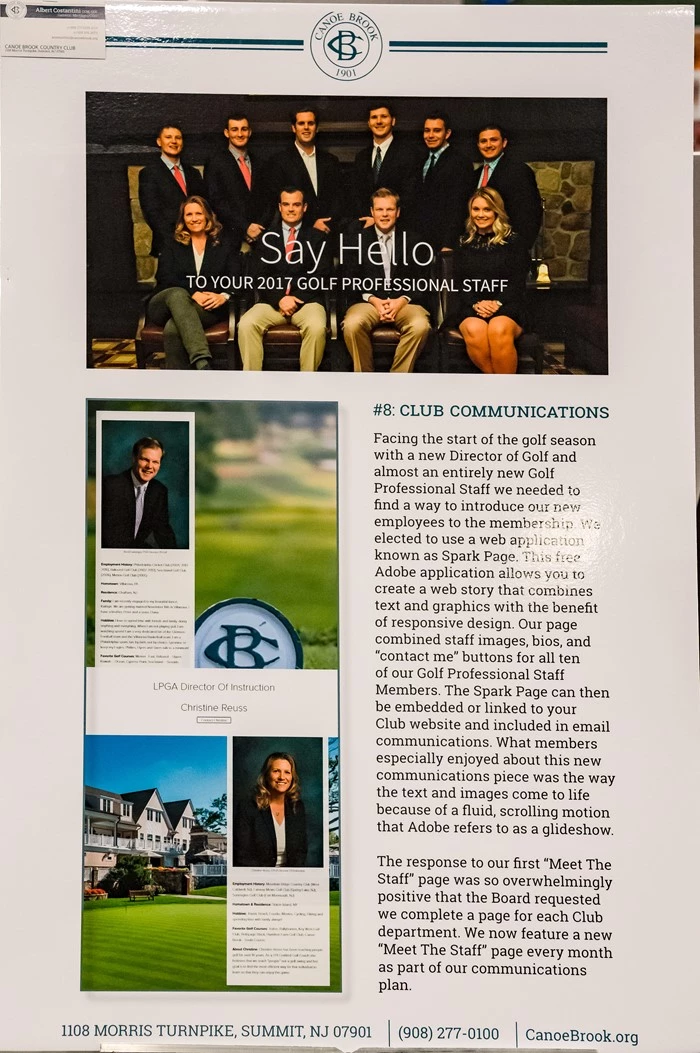 Facing the start of the golf season with a new Director of Golf and almost an entirely new Golf Professional Staff we needed to find a way to introduce our new employees to the membership. We elected to use a web application known as Spark Page. This free Adobe application allows you to create a web story that combines text and graphics with the benefit of responsive design. Our page combined staff images, bios, and “contact me” buttons for all ten of our Golf Professional Staff Members. The Spark Page can then be embedded or linked to your Club website and included in email communications. What members especially enjoyed about this new communications piece was the way the text and images come to life because of a fluid, scrolling motion that Adobe refers to as a glideshow.