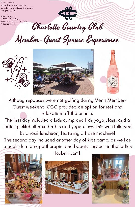 Although spouses were not golfing during Men’s Member-Guest weekend, CCC provided an option for rest and relaxation off the course. The first day included a kids camp and kids yoga class, and a ladies pickleball round robin and yoga class. This was followed by a rosé luncheon, featuring a frosé machine! The second day included another day of kids camp, as well as a poolside massage therapist and beauty services in the ladies locker room!