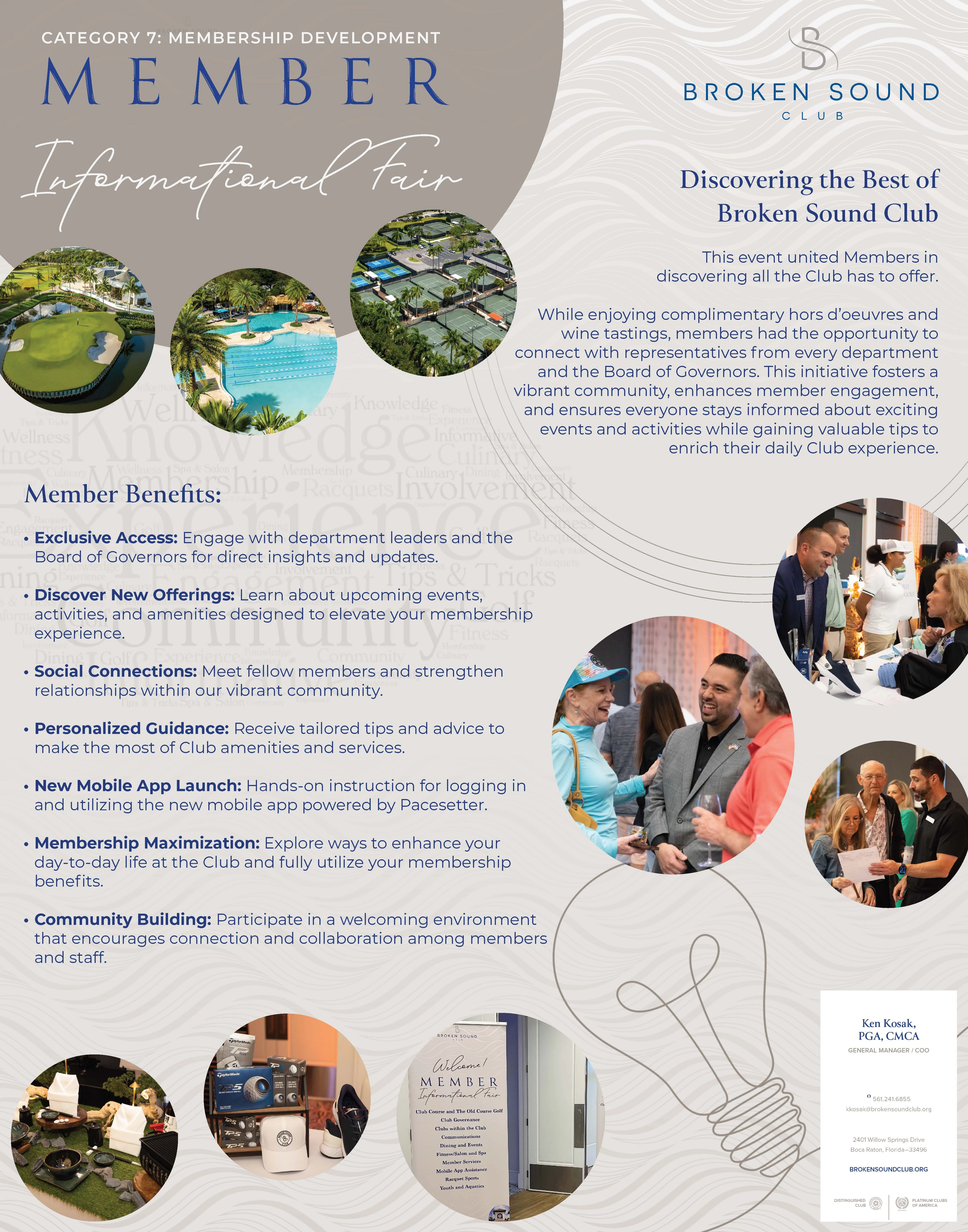The Informational Fair was organized with the support of managers and directors from every department at Broken Sound, who collaborated to highlight the Club’s offerings, including amenities, culinary options, social activities, and more. The fair also marked the launch of our new mobile app, offering Members the chance to receive on-site guidance for logging in and navigating the app. As Broken Sound is a very active Club with new members joining throughout the year and seasonal Members returning, the event provided a great opportunity for all Members to explore the club, learn about upcoming events and activities, and connect with their neighbors. The Member reaction was extremely positive, with over 400 attending and rave reviews for the education and integration it provided Members.