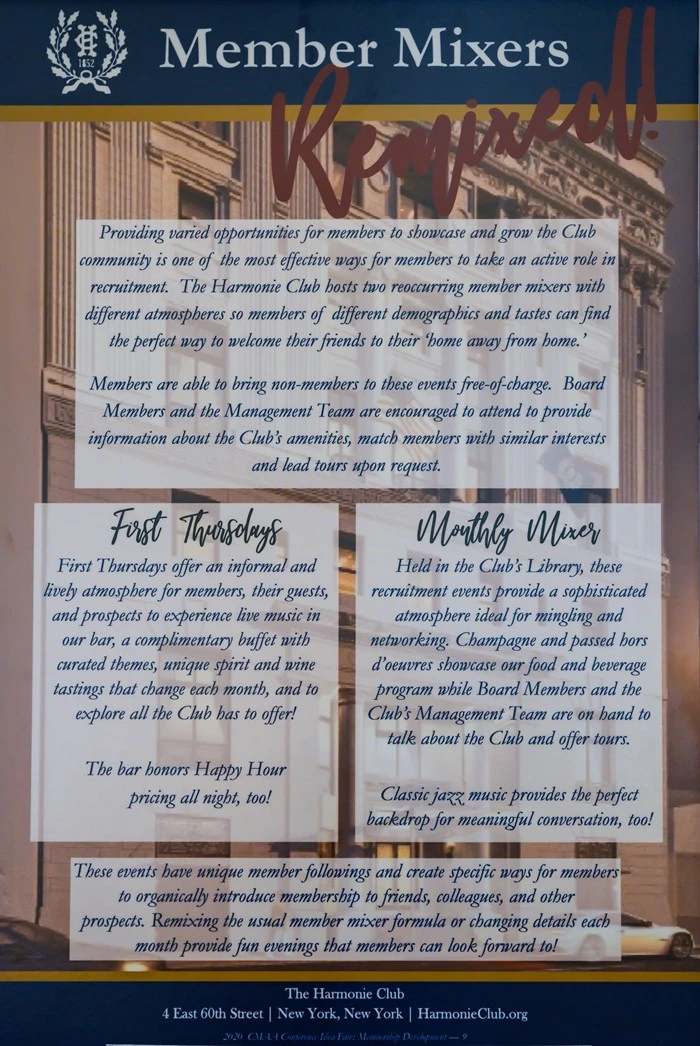 The idea was implemented with the input of the Membership Committee and by getting lots of feedback from members. The reactions from members have been very positive. Older members prefer the Monthly Cocktail Mixers in the Library because it is a more subdued atmosphere and a lot of younger members enjoy the liveliness of the First Thursday events in the bar with live bands. Both events have truly become a staple of the calendar at the Club and members look forward to them.