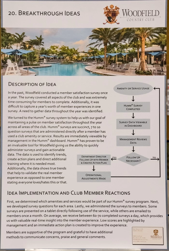 We turned to the Humm® survey system to help us with our goal of maintaining a pulse on member satisfaction throughout the year across all areas of the club. Humm® surveys are succinct, 7 to 10 question surveys that are administered directly after a member has used a club amenity or service. Results are immediately viewable by management in the Humm® dashboard. Humm® has proven to be an invaluable tool for Woodfield giving us the ability to quickly administer surveys and gain actionable data. The data is used to identify trends, create action plans and direct additional training where it is needed most. Additionally, the data shows true trends that help to validate the real member experience as opposed to one member stating everyone loves/hates this or that.