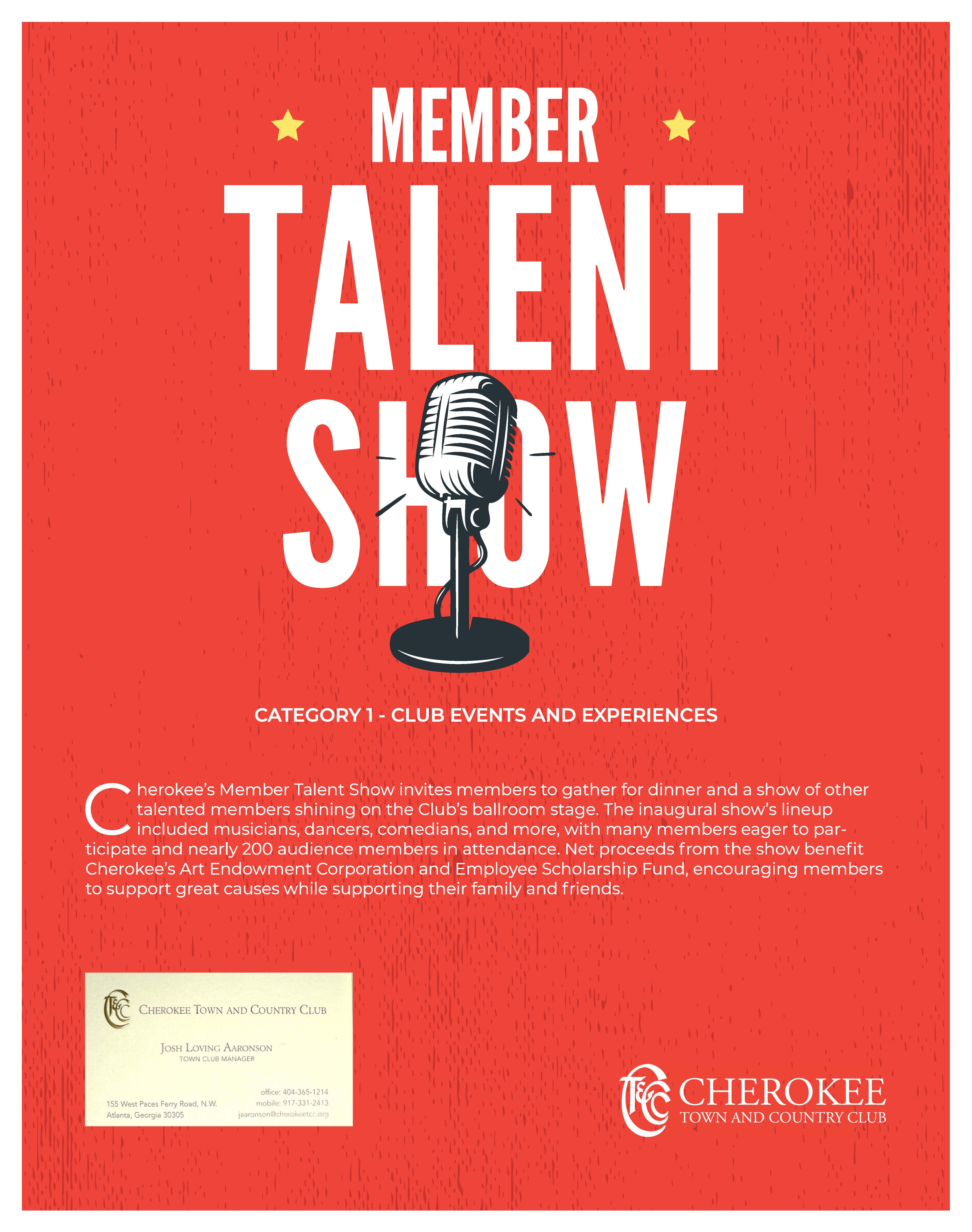 Our President wanted to add a new club event for members to experience. Our director of catering, communications team and our executive clubhouse manager created the blueprint. We determined how members would submit and criteria to follow. Next the executive committee voted on the finalist to send to the talent show. We finished with 10 participants including singing, comedy, impersonations, flamenco dancing, and instrumentals. Members raved about inviting friends and family to join in supporting our members.