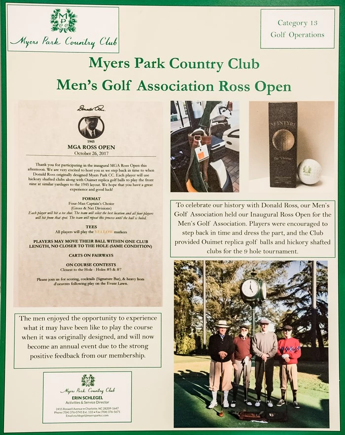 This tournament was created to bring our members back to the beginning of our Club's history, and our Donald Ross course design. Our golf professionals provided Ouimet replica golf balls and hickory shafted clubs. The tournament shifted the focus from solely the goal of winning the tournament, to having fun stepping back in time to immerse themselves in our club history. Our men’s golf association even took it upon themselves to dress the part for the tournament. Overall, the tournament enhanced our operation by expanding our golf offerings and strengthening our ties to our history, while giving the men a fun challenge that they have not yet had the opportunity to enjoy.