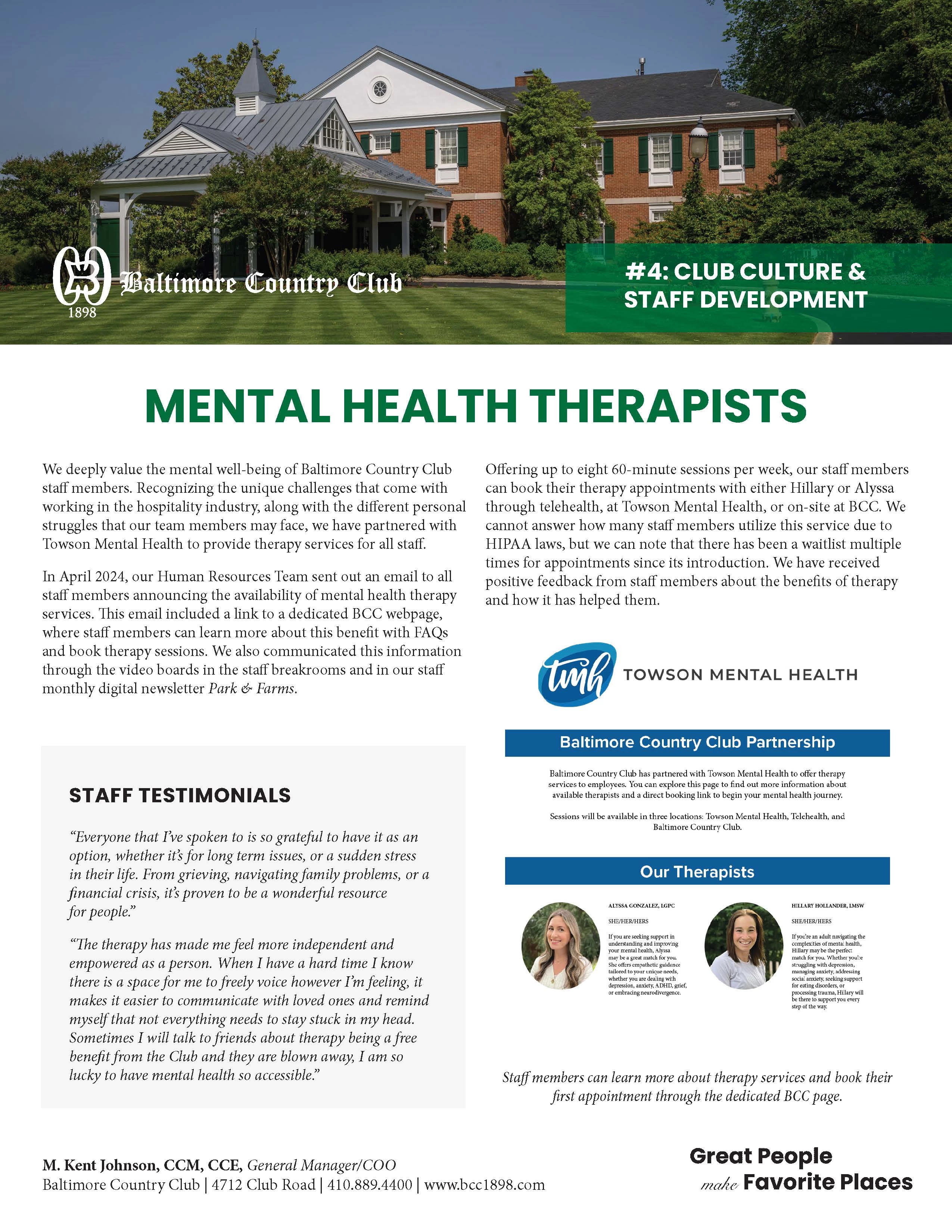 We deeply value the mental well-being of Baltimore Country Club staff members. Recognizing the unique challenges that come with working in the hospitality industry, along with the different personal struggles that our team members may face, we have partnered with Towson Mental Health to provide therapy services for all staff.
