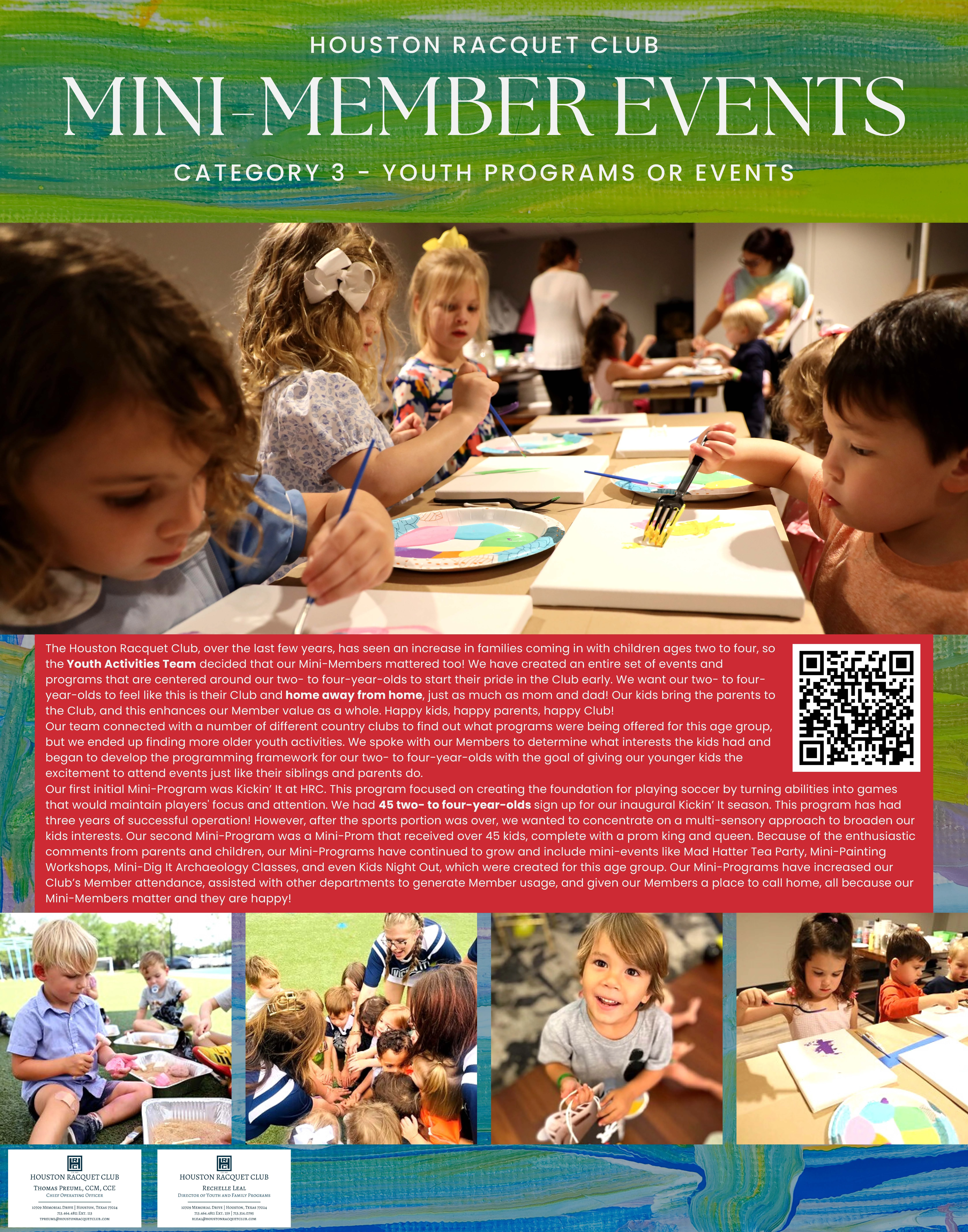 Our team connected with a number of different country clubs to find out what programs were being offered for this age group, but we ended up finding more older youth activities. We spoke with our Members to determine what interests the kids had and began to develop the programming framework for our two- to four-year-olds with the goal of giving our younger kids the excitement to attend events just like their siblings and parents do. Our Mini-Programs have increased our Club’s Member attendance, assisted with other departments to generate revenue, and given our Members a place to call home, all because our Mini-Members matter and they are happy!