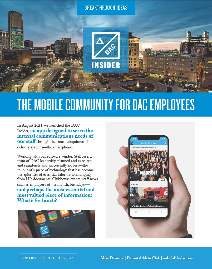 In August 2021, we launched the DAC Insider, an app designed to serve the internal communications needs of our staff through that most ubiquitous of delivery systems—the smartphone.