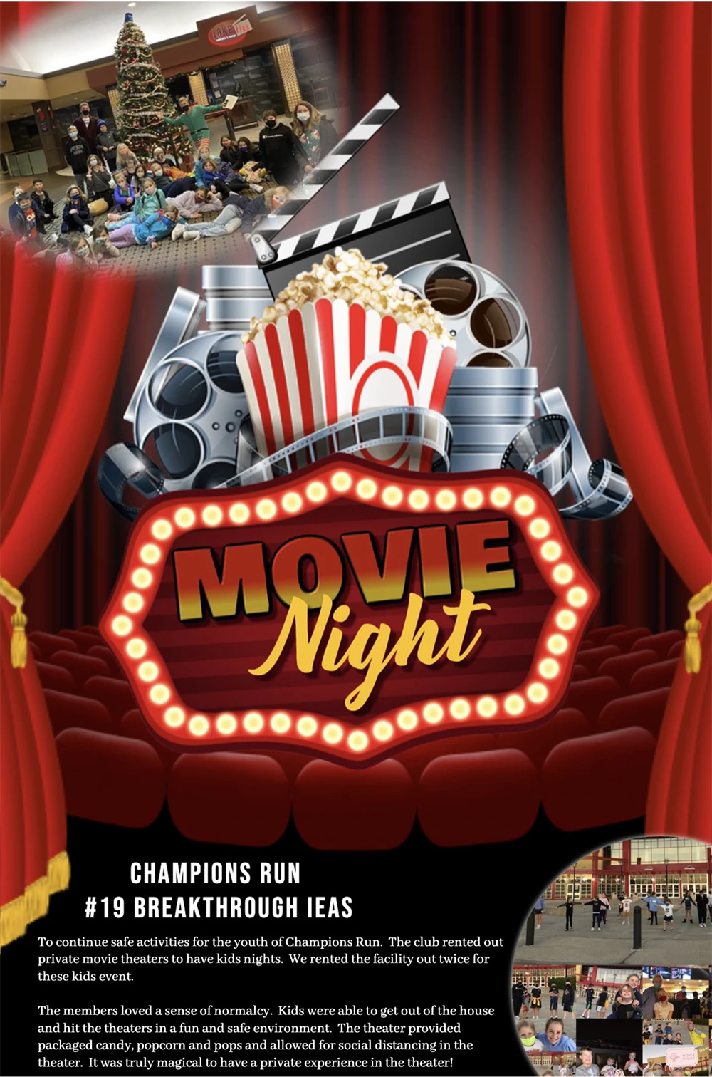 To continue safe activities for the youth of Champions Run. The club rented out private movie theaters to have kids nights. We rented the facility out twice for these kids event.