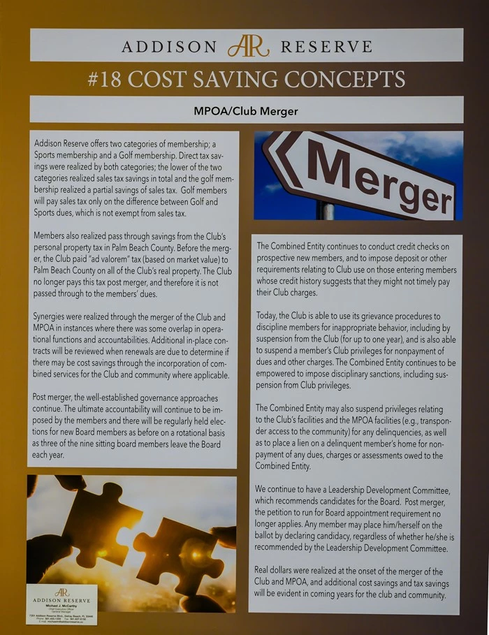 Many hours of review and legal advice took place prior to the presentation of this merger to the membership. The membership was then asked and encouraged to vote on the merger in the interest of cost savings through the avenues mentioned. The membership overwhelmingly voted to approve the merger and after additional legal review and documentation, the merger was culminated. This year was the first time that Members received some savings based on the tax structure. Members will see additional savings in years to come, which will be a positive factor in their club fees and real estate property values.