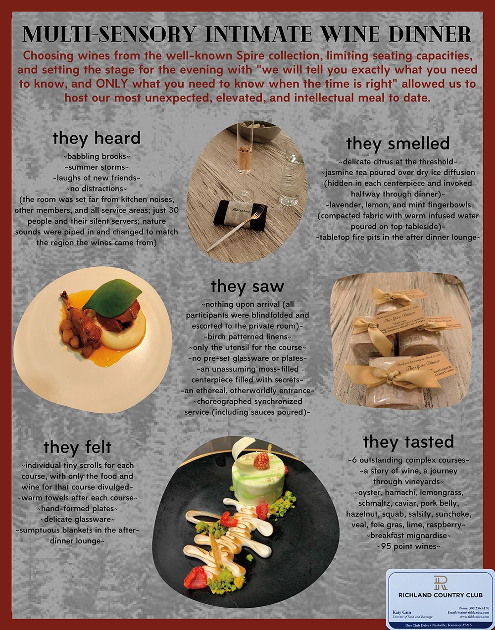 In the cold winter months, we find it particularly hard to have events as vibrant as we host. We leaned into with this dinner, which had a more subdued and moody feel than most of our most popular events, and delivered a product that was unexpected, elevated, and grand without being pretentious. The vintner-selected regional manager for Spire Collection came to walk the members through the journey of wine, and the staff was impeccably trained to walk them through the journey of food. By limiting seating for a more intimate dining experience, we were able to deliver on the high promise of flawless, comfortable, and unobtrusive service throughout the dinner.