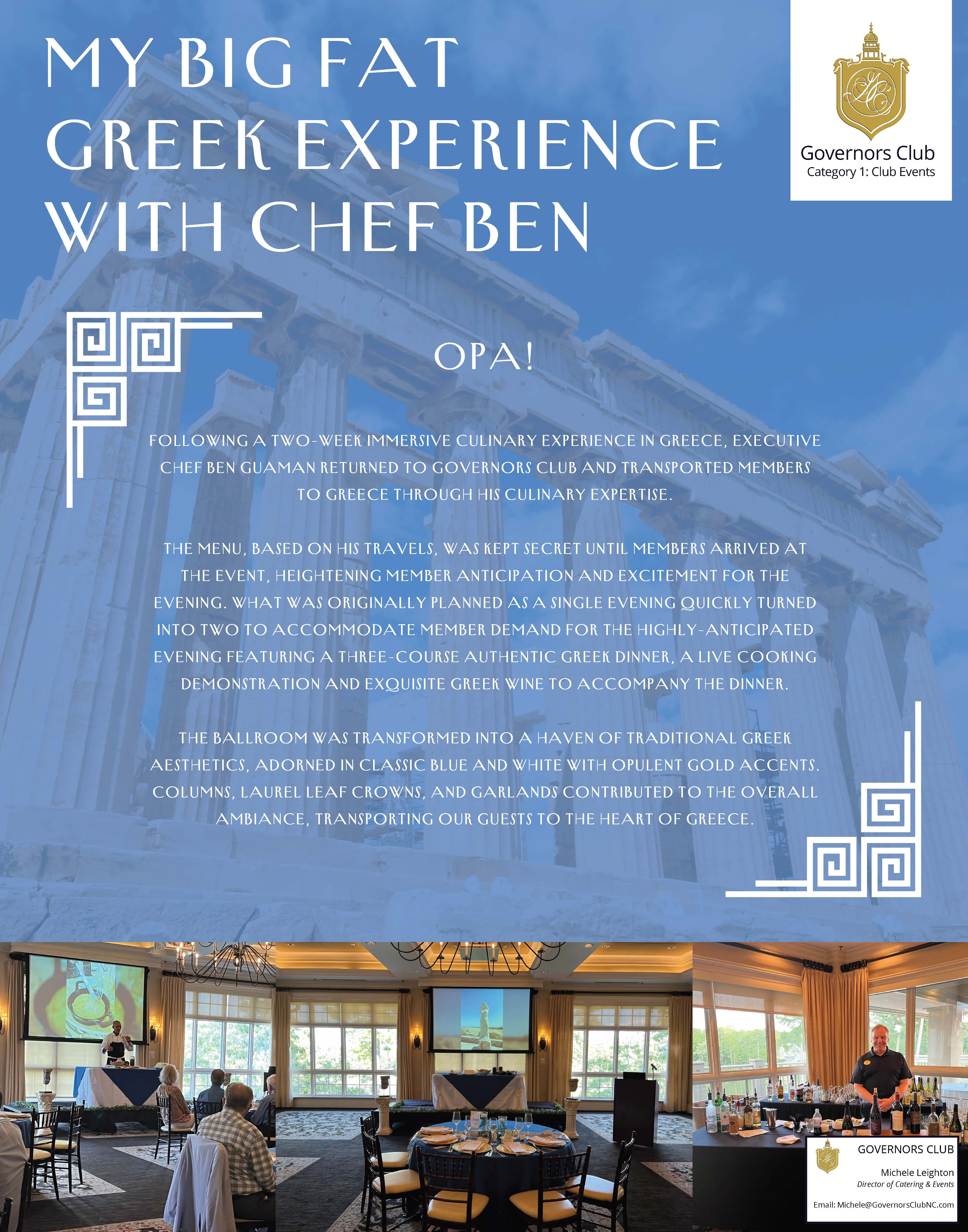 The genesis of this extraordinary event began with Chef Ben sharing his experiences and culinary insights during a departmental food and beverage meeting. His infectious passion and enthusiasm left everyone eagerly anticipating more. It was at that moment when someone exclaimed, "Our members would LOVE to hear these stories, Chef!" Following careful planning, we selected a date, and Chef Ben crafted a delightful "surprise" Greek menu. The first night sold out in minutes, prompting the addition of a second night, both of which became sell-out successes.