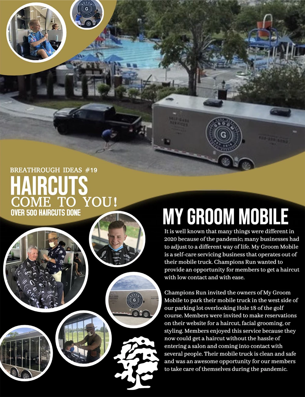 It is well known that many things were different in 2020 because of the pandemic; many businesses had to adjust to a different way of life. My Groom Mobile is a self-care servicing business that operates out of their mobile truck. Champions Run wanted to provide an opportunity for members to get a haircut with low contact and with ease.