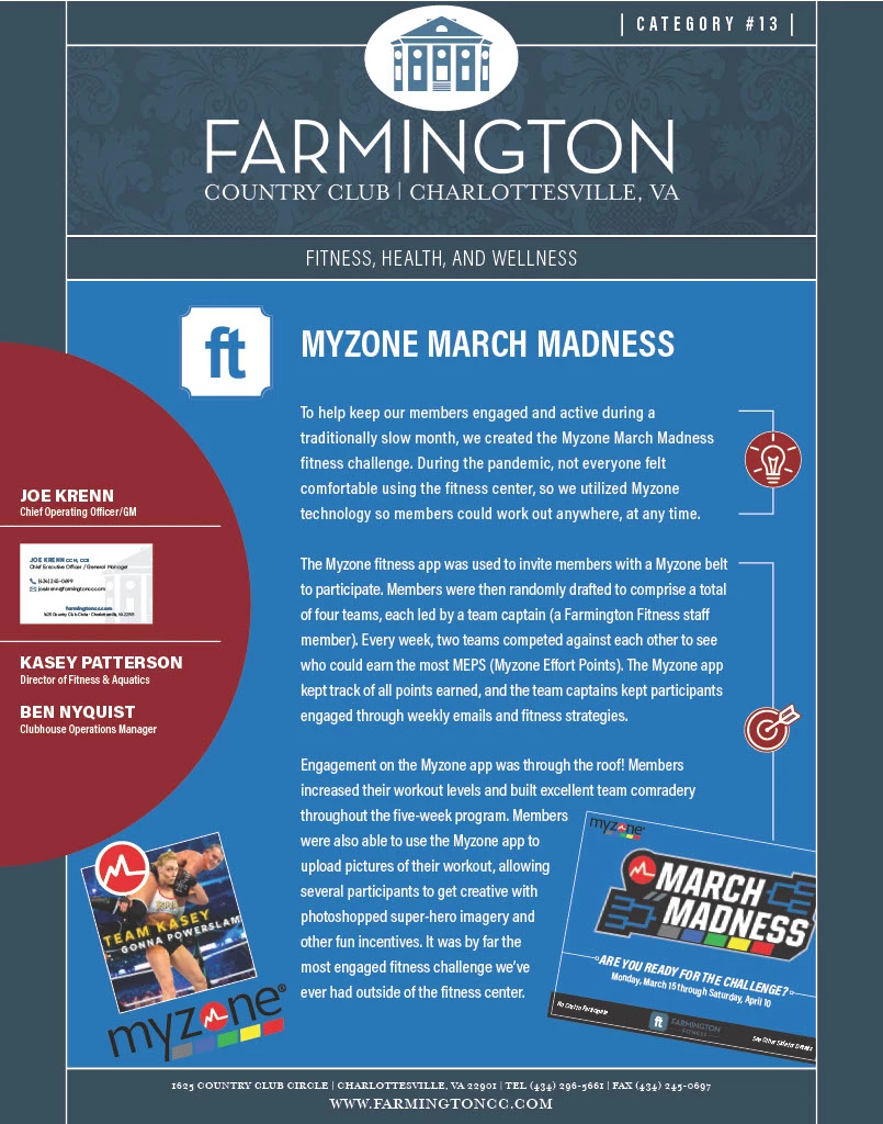 To help keep our members engaged and active during a traditionally slow month, we created the Myzone March Madness fitness challenge. During the pandemic, not everyone felt comfortable using the fitness center, so we utilized Myzone technology so members could work out anywhere, at any time.