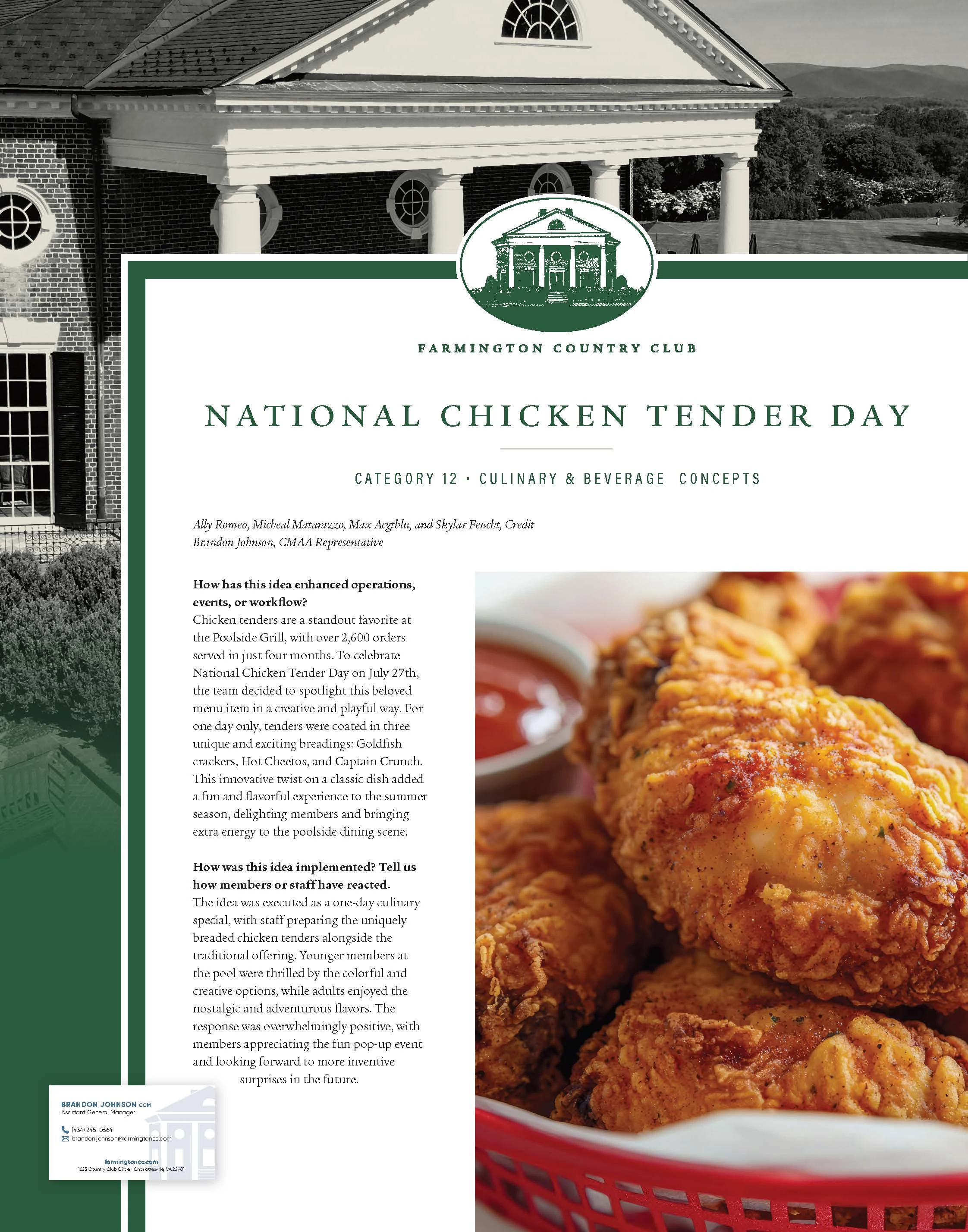 Chicken tenders are a standout favorite at the Poolside Grill, with over 2,600 orders served in just four months. To celebrate National Chicken Tender Day on July 27th, the team decided to spotlight this beloved menu item in a creative and playful way. For one day only, tenders were coated in three unique and exciting breadings: Goldfish crackers, Hot Cheetos, and Captain Crunch. This innovative twist on a classic dish added a fun and flavorful experience to the summer season, delighting members and bringing extra energy to the poolside dining scene.
