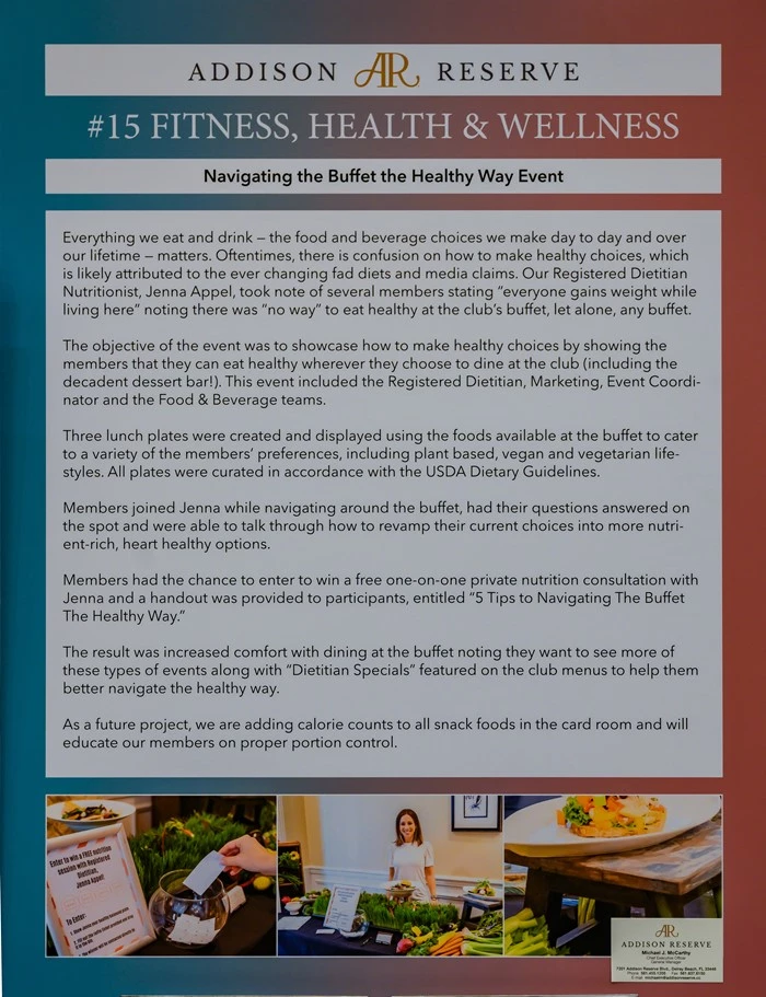 Navigating the Buffet the Healthy Way Event is one offering in our Health and Wellness focus for our Membership. Presented by our Registered Dietitian Nutritionist Jenna Appel, Members have an opportunity to tour the buffet with Jenna and discover the best healthy food items for their individual dietary needs. We are increasing awareness among our Members through this event with Jenna, as well as through her speaker series and personal one-on-one consultations on Health, Wellness and Longevity.