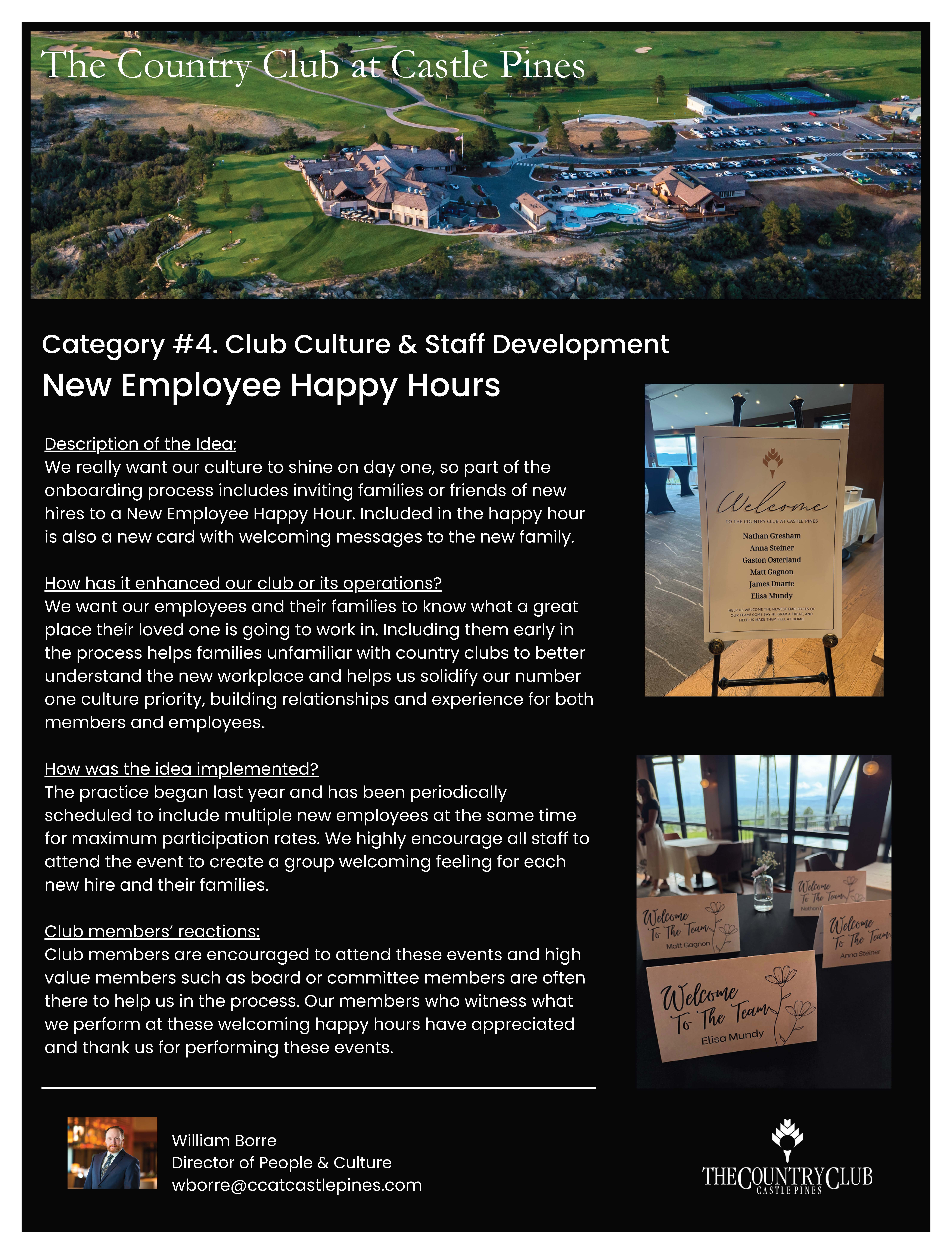 The practice began last year and has been periodically scheduled to include multiple new employees at the same time for maximum participation rates. We highly encourage all staff to attend the event to create a group welcoming feeling for each new hire and their families. Club members are encouraged to attend these events and high value members such as board or committee members are often there to help us in the process. Our members who witness what we perform at these welcoming happy hours have appreciated and thank us for performing these events.
