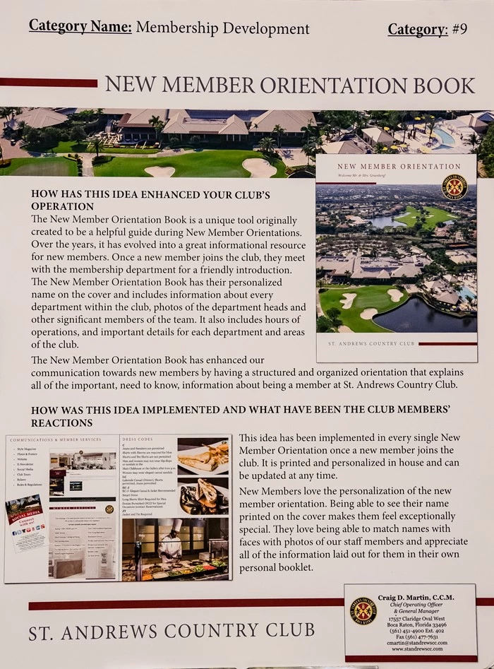 The New Member Orientation Book has enhanced our communication towards new members by having a structured and organized orientation that explains all of the important, need to know, information about being a member at St. Andrews Country Club.