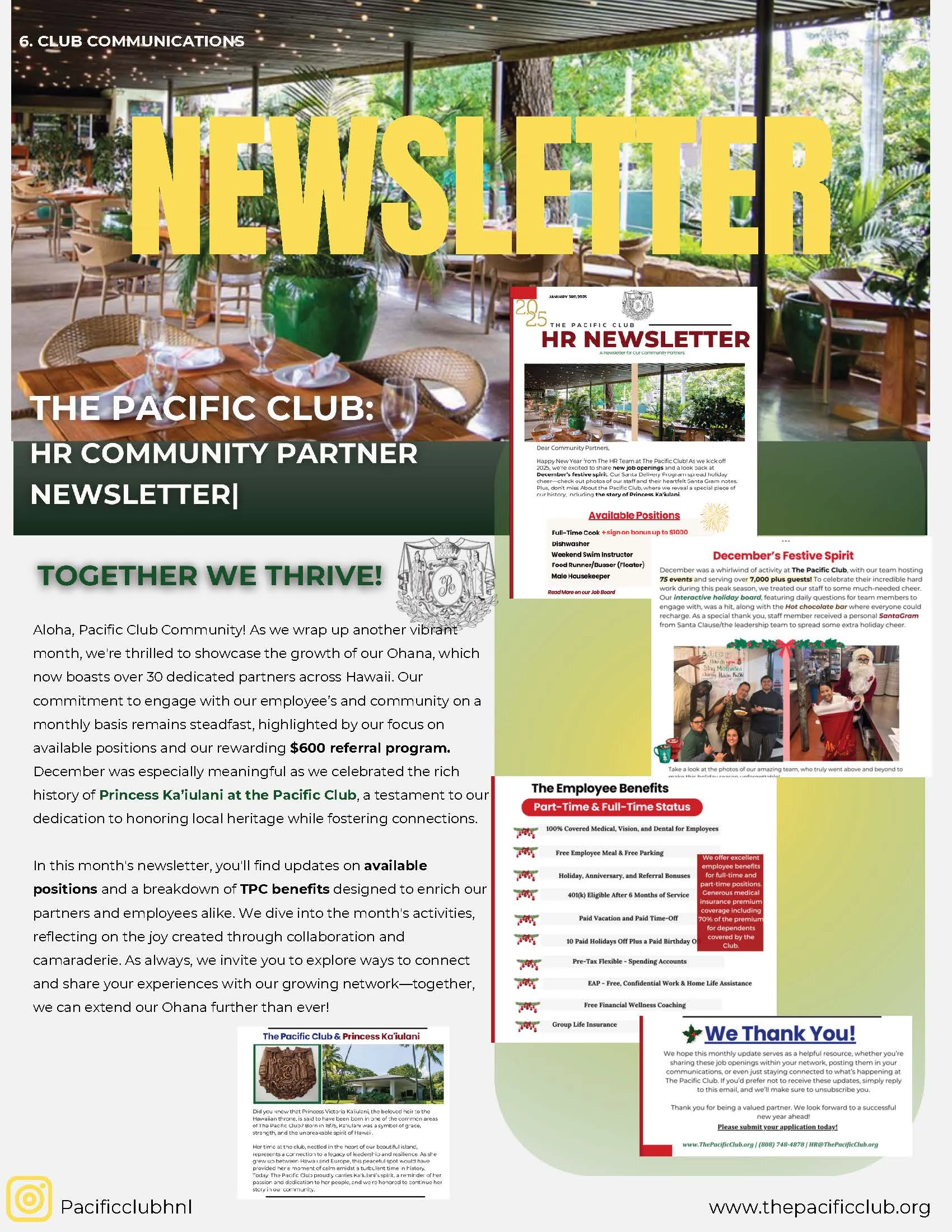 In 2024, the HR team launched the monthly newsletter, a dynamic platform designed to connect our growing community of 30+ partners and keep everyone informed about the amazing work happening at the club. The newsletter showcases employee achievements, highlights open roles, and promotes incentives like the Employee Referral Program, which offers a $600 incentive for successful referrals. This creates a space for our Ohana to share opportunities within their networks. The initiative has significantly enhanced our operations by strengthening connections within the community and attracting top talent through the referral program.