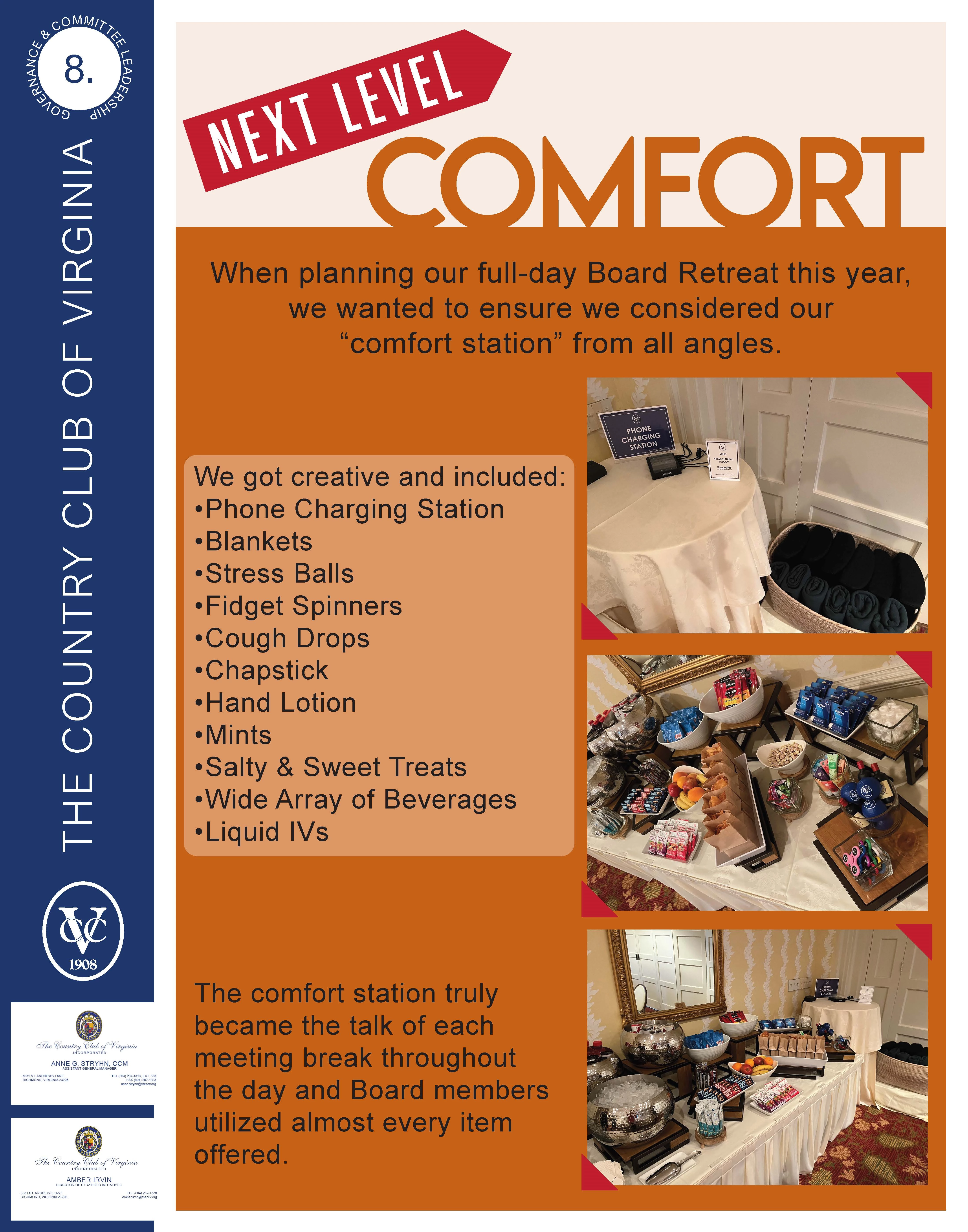 When planning our full day Board Retreat this year, we wanted to ensure we considered our “comfort station” from all angles. It was more than just food and beverage items, but true comforts that made the long day a little more bearable.