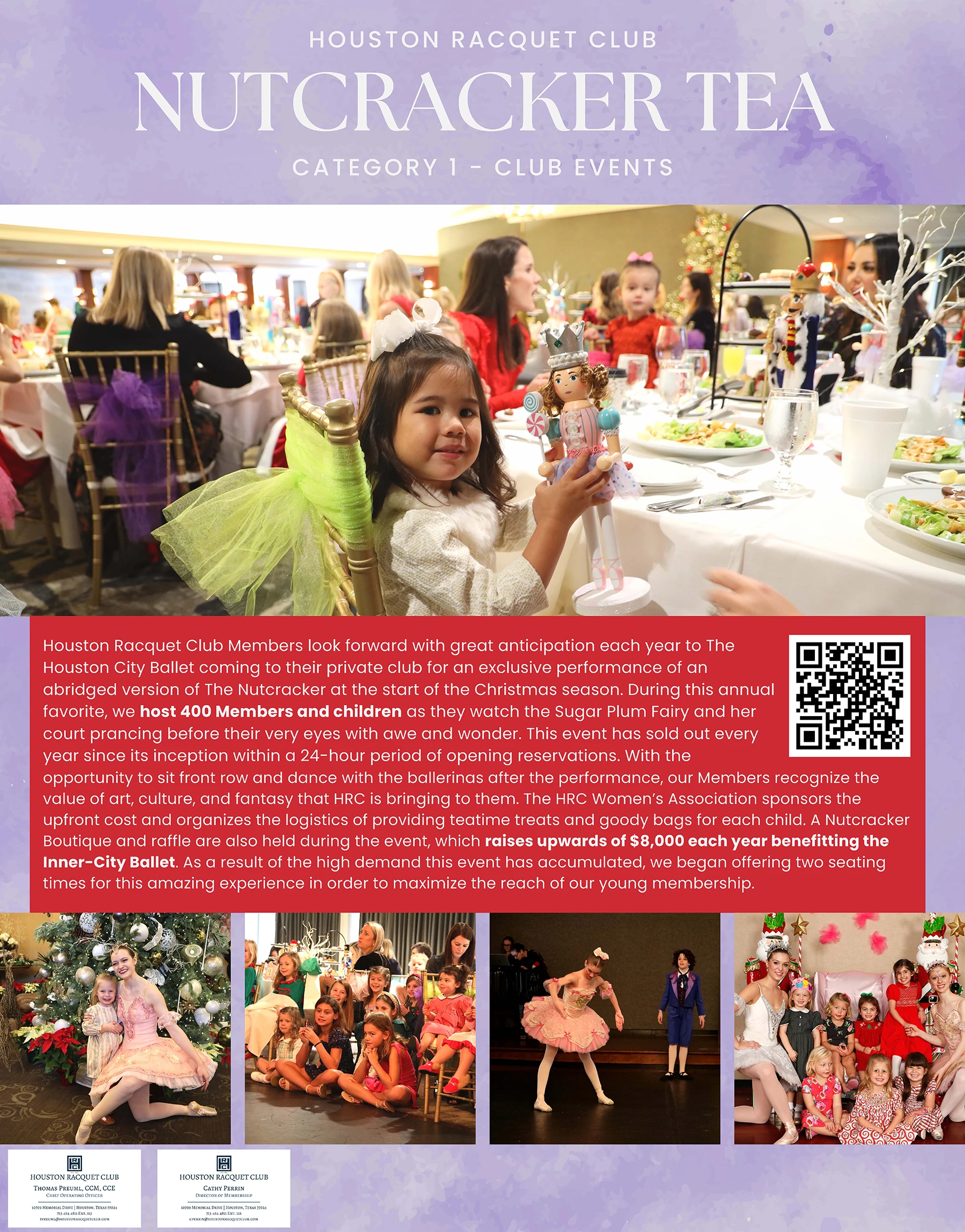 The Houston Racquet Club Women’s Association sponsors the upfront cost and organizes the logistics of providing teatime treats and goody bags for each child. A Nutcracker Boutique and raffle are also held during the event, which raises upwards of $8,000 each year benefiting the Inner-City Ballet. This is a much-awaited Member favorite event.
