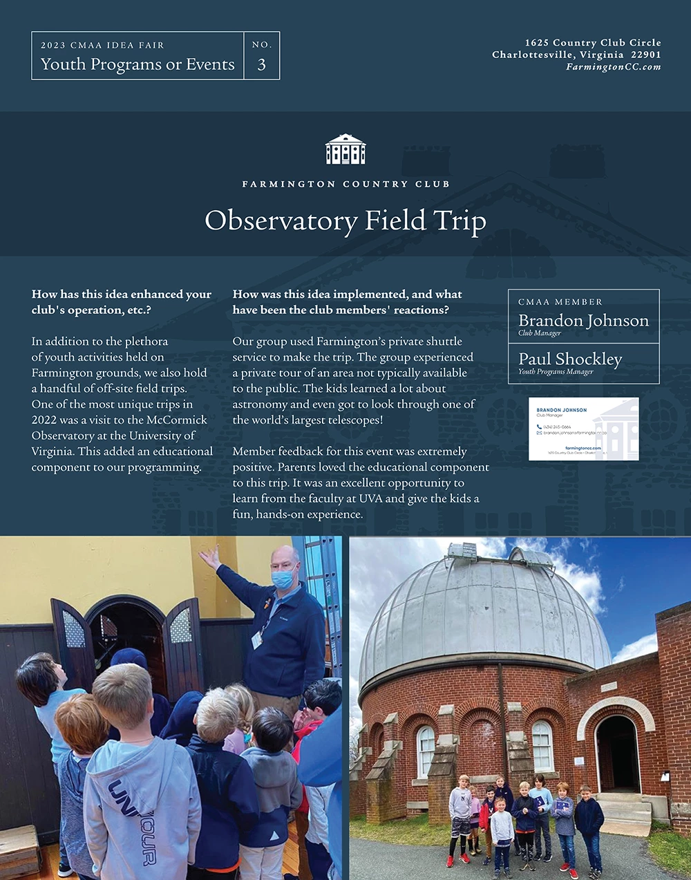 Our group used Farmington’s private shuttle service to make the trip. The group experienced a private tour of an area not typically available to the public. The kids learned a lot about astronomy and even got to look through one of the world’s largest telescopes! Member feedback for this event was extremely positive. Parents loved the educational component to this trip. It was an excellent opportunity to learn from the faculty at UVA and give the kids a fun, hands-on experience.