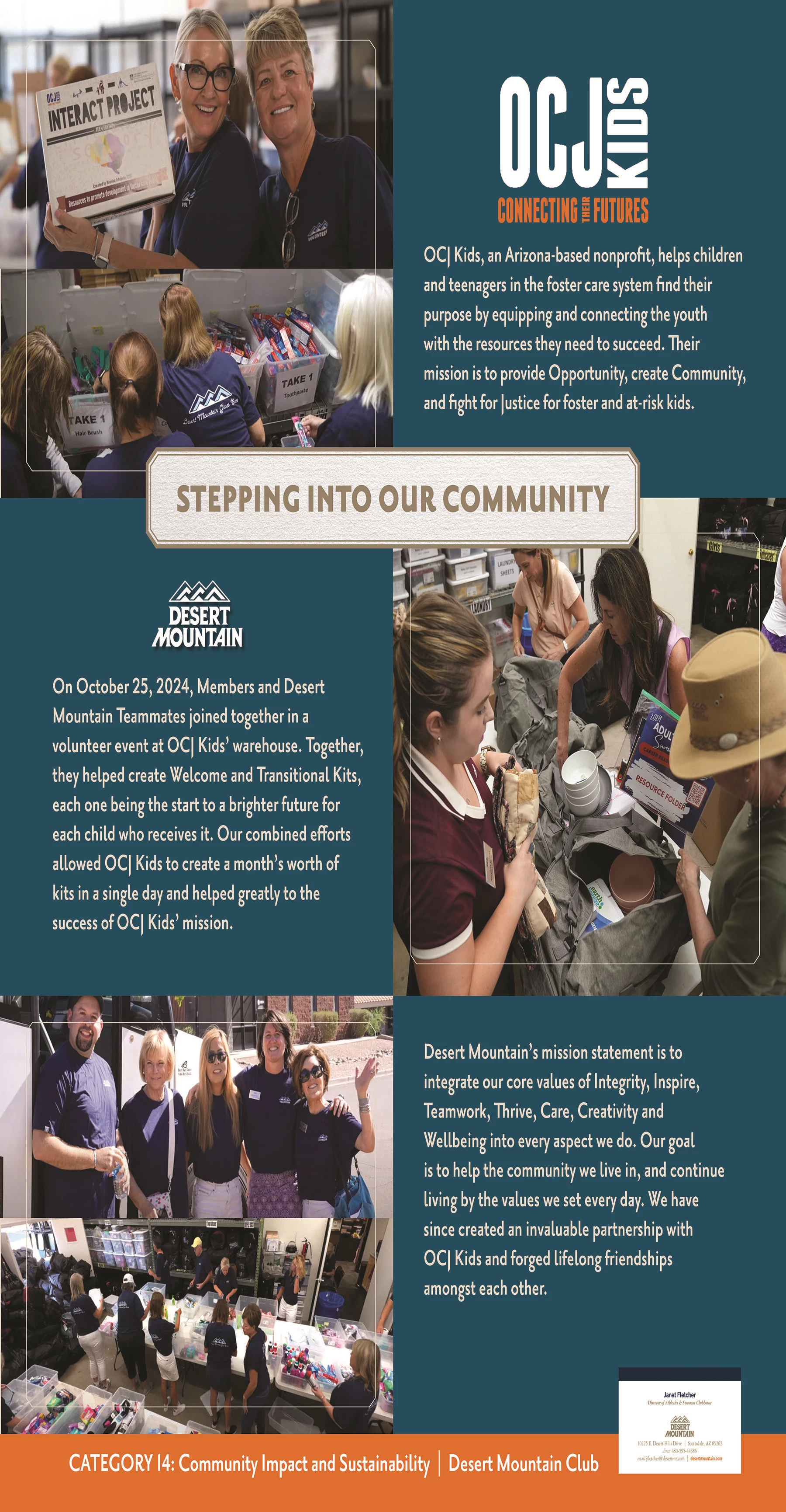 Desert Mountain’s mission statement is to integrate our core values of Integrity, Inspire, Teamwork, Thrive, Care, Creativity and Wellbeing into every aspect we do. Our goal was to help the community we live in and continue living by the values we set every day. We have since created an invaluable partnership with OCJ Kids and forged lifelong friendships amongst each other.