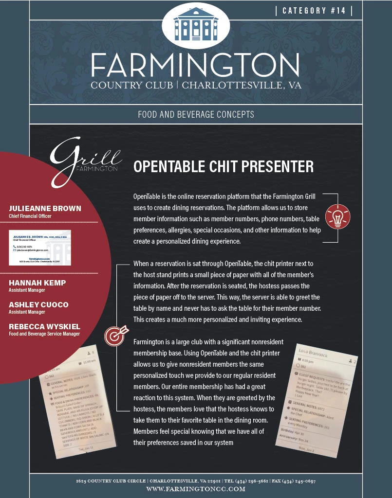 Farmington is a large club with a significant nonresident membership base. Using OpenTable and the chit printer allows us to give nonresident members the same personalized touch we provide to our regular resident members. Our entire membership has had a great reaction to this system. When they are greeted by the hostess, the members love that the hostess knows to take them to their favorite table in the dining room. Members feel special knowing that we have all of their preferences saved in our system.