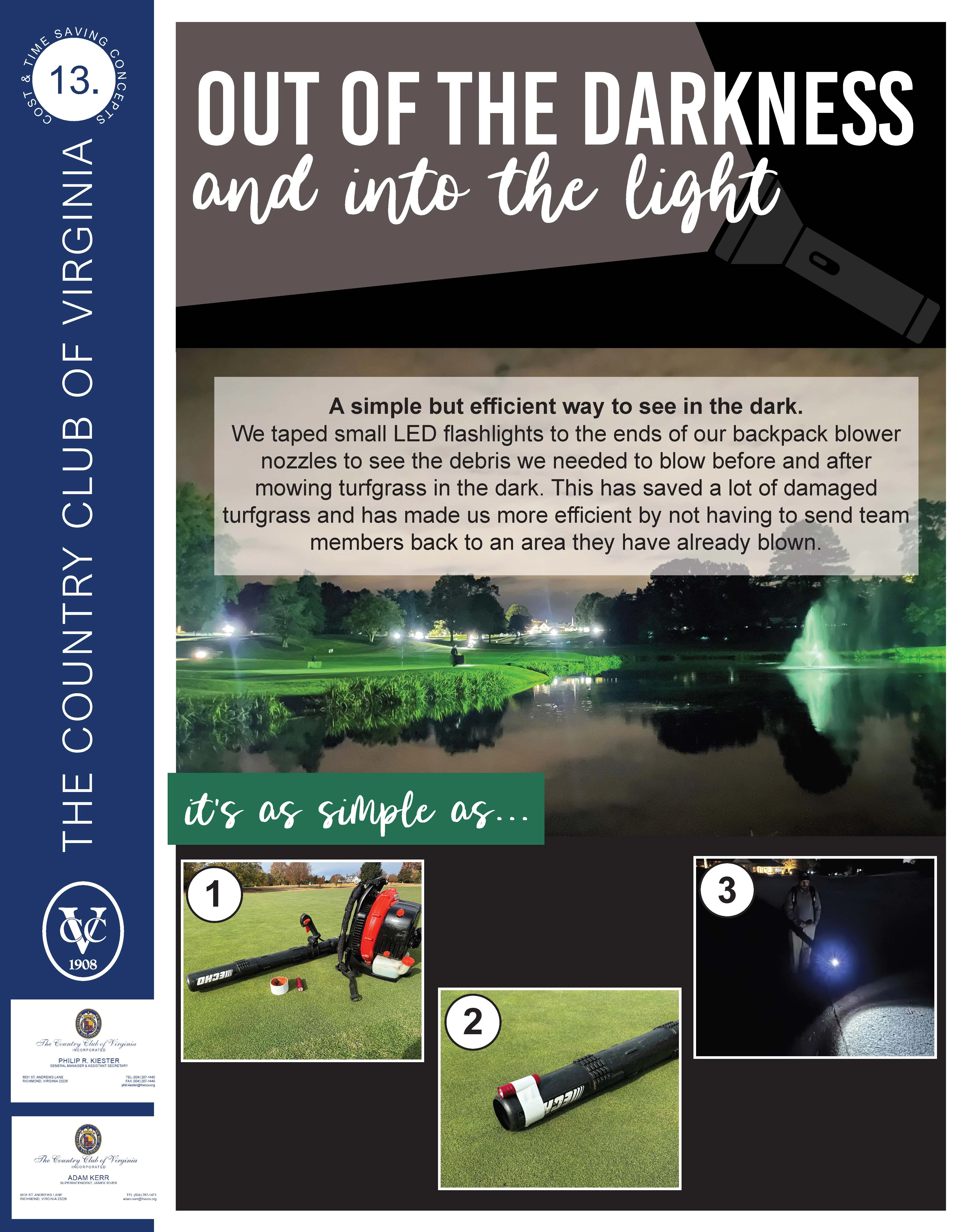 This idea was implemented from many hours spent in the dark during the professional golf tournament we have hosted for the past 9 years. Before we put the lights on the blowers, we would miss debris which could damage the turf when mowing, and we were spending a lot of time sending team members back to blow the same areas again because of missed debris. The members seem to be happy because we are able to stay out in front of play on those dark mornings, and the tournament has continuously gotten better.