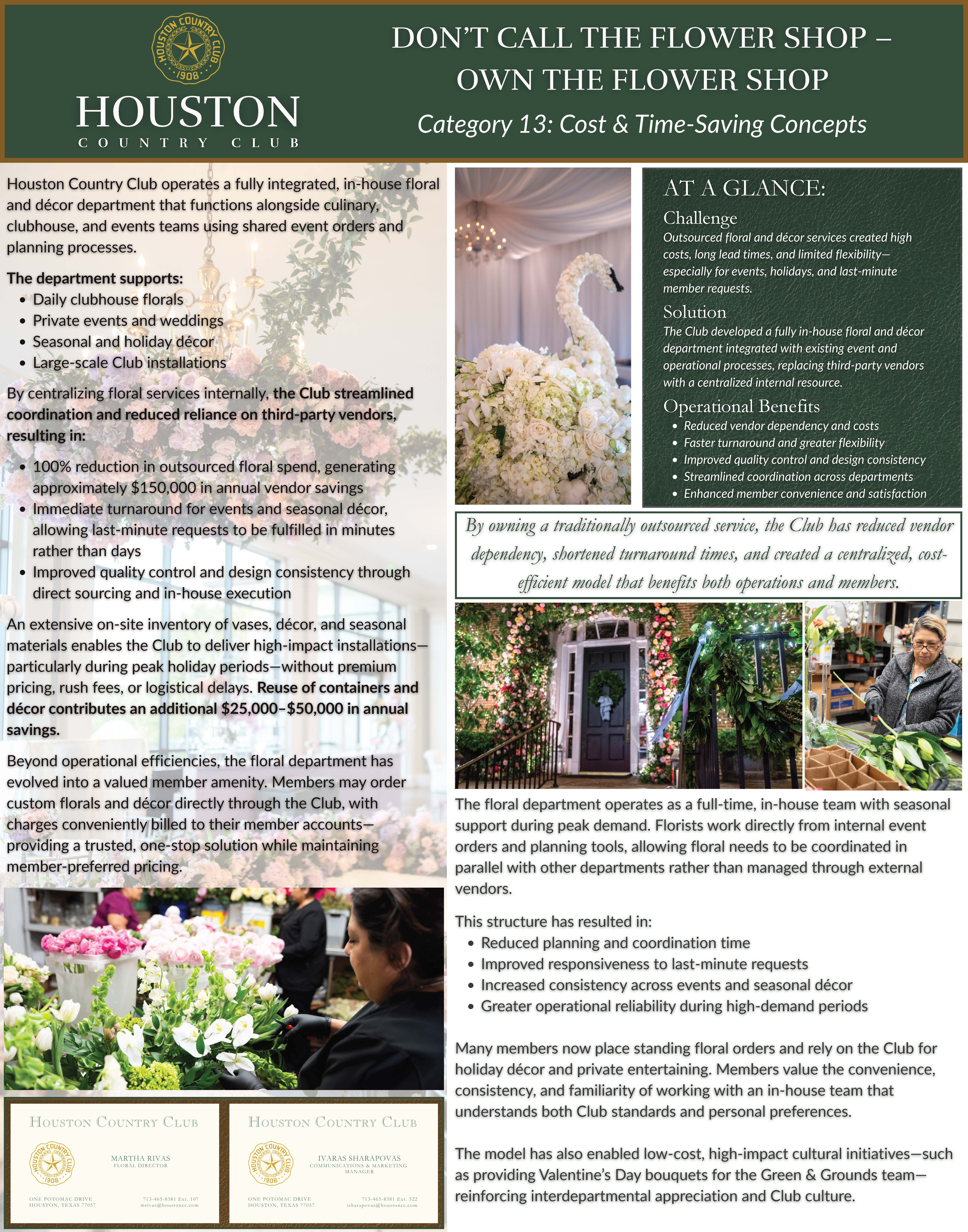 Houston Country Club has intentionally evolved an in-house floral and décor department into a fully integrated operational resource—transforming a traditionally outsourced service into a centralized model that saves time, controls costs, and enhances both Club operations and the member experience.