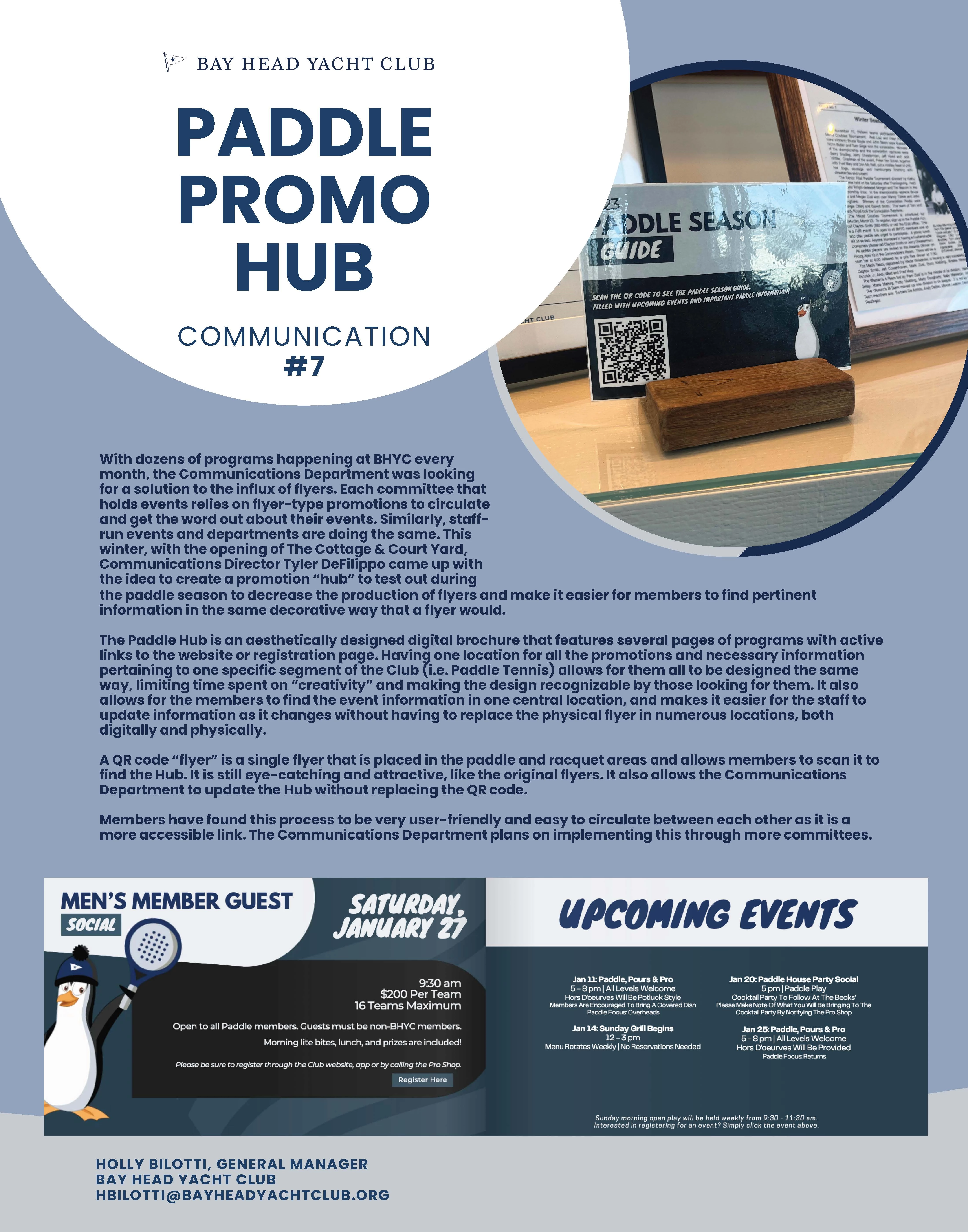 With dozens of programs happening at BHYC every month, the Communications Department was looking for a solution to the influx of flyers. Each committee that holds events relies on flyer-type promotions to circulate and get the word out about their events. Similarly, staff-run events and departments are doing the same. This winter, with the opening of The Cottage & Court Yard, Communications Director Tyler DeFilippo came up with the idea to create a promotion “hub” to test out during the paddle season to decrease the production of flyers and make it easier for members to find pertinent information in the same decorative way that a flyer would.