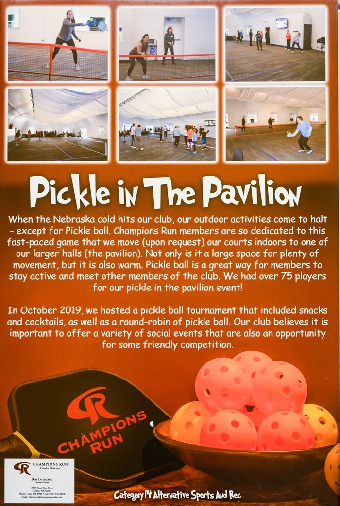 When the Nebraska cold hits our club, our outdoor activities come to halt - except for Pickleball. Champions Run members are so dedicated to this fast-paced game that we move (upon request) our courts indoors to one of our larger halls. Not only is it a large space for plenty of movement, but it is also warm. Pickleball is a great way for members to stay active and meet other members of the club.