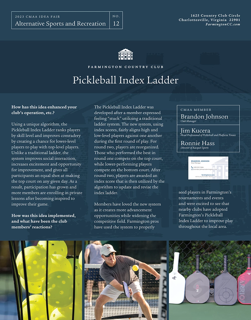Using a unique algorithm, the Pickleball Index Ladder ranks players by skill level and improves comradery by creating a chance for lower-level players to play with top-level players. Unlike a traditional ladder, the system improves social interaction, increases excitement and opportunity for improvement, and gives all participants an equal shot at making the top court on any given day. As a result, participation has grown and more members are enrolling in private lessons after becoming inspired to improve their game.