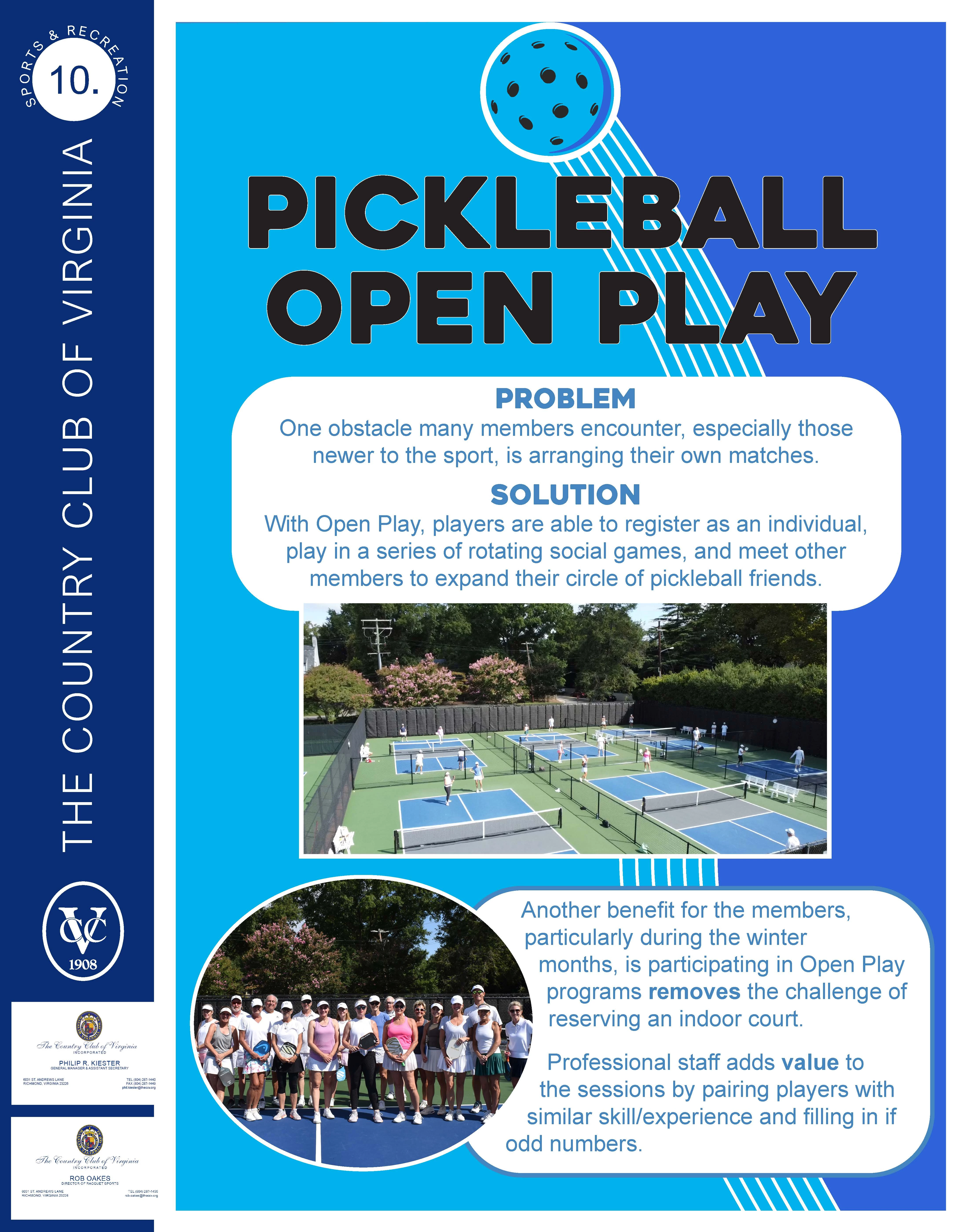 Pickleball Open Play is a format where members sign up to play pickleball as an individual and professional staff facilitates rotating games with other members of similar skill level. Open Play supplements traditional foursome play, league play, and instruction, providing an ideal alternative for members looking to play the sport more socially.