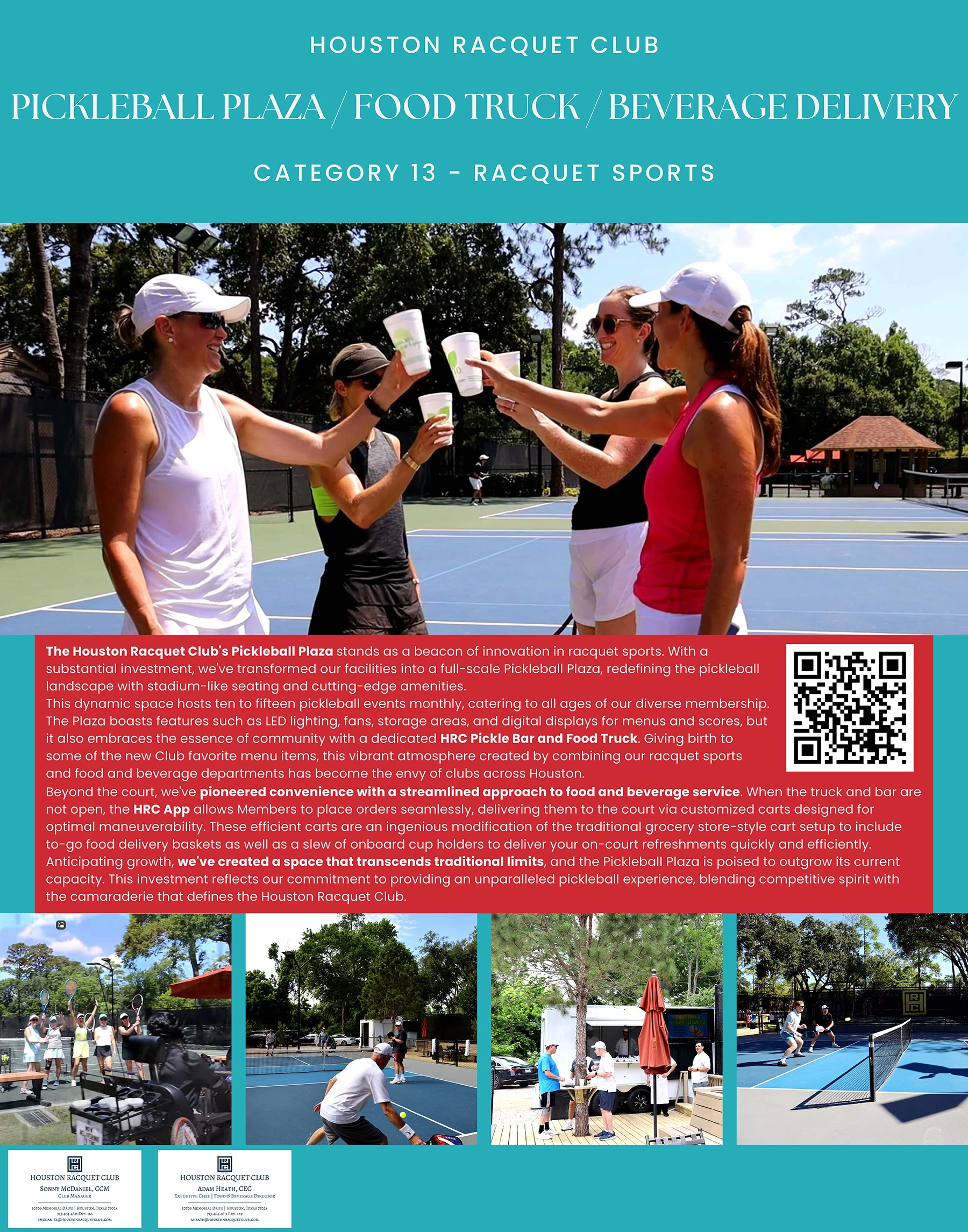 The Houston Racquet Club's Pickleball Plaza hosts ten to fifteen pickleball events monthly, catering to all ages of our diverse membership. The Plaza boasts features such as LED lighting, fans, storage areas, and digital displays for menus and scores, but it also embraces the essence of community with a dedicated HRC Pickle Bar and Food Truck. When the truck and bar are not open, the HRC App allows Members to place orders seamlessly, delivering them to the court via customized carts.