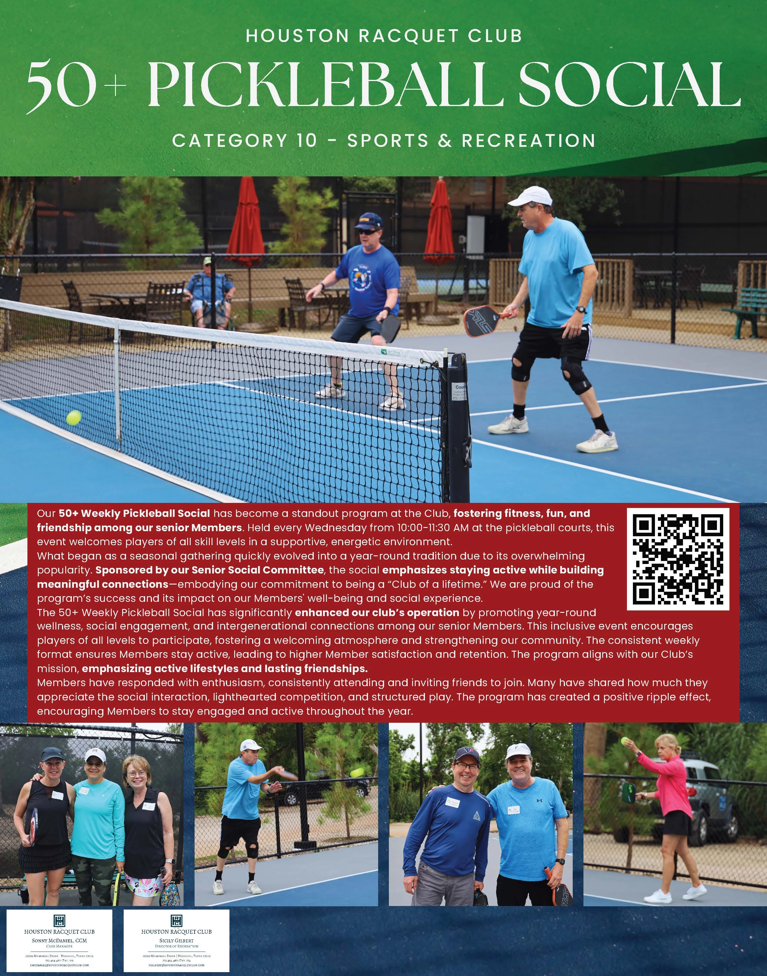 The 50+ Weekly Pickleball Social has significantly enhanced our Club’s operation by promoting year-round wellness, social engagement, and intergenerational connections among our senior Members. This inclusive event encourages players of all levels to participate, fostering a welcoming atmosphere and strengthening our community. The consistent weekly format ensures Members stay active, leading to higher Member satisfaction and retention. The program aligns with our Club’s mission emphasizing active lifestyles and lasting friendships.