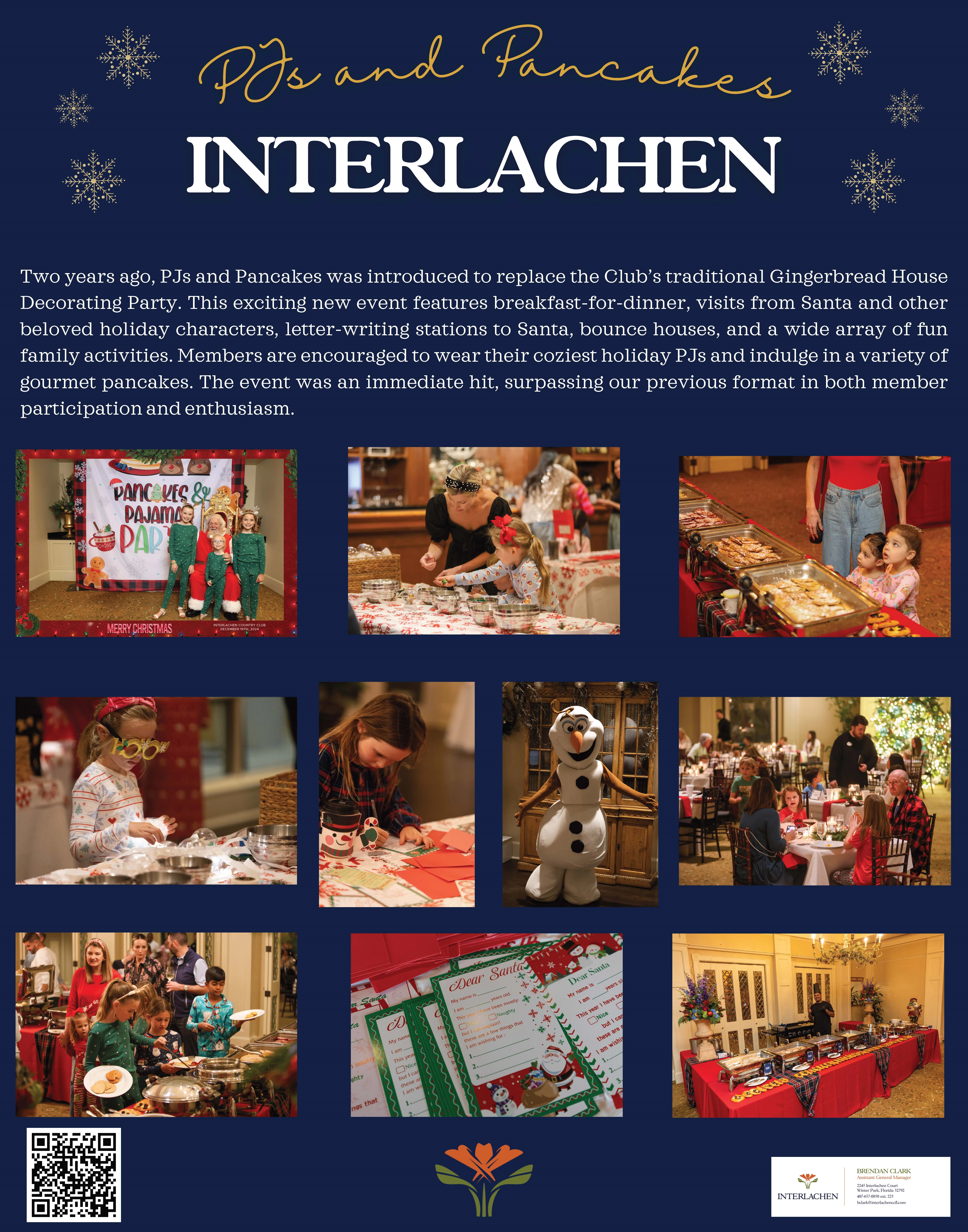 Two years ago, PJs and Pancakes was introduced to replace the Club’s traditional Gingerbread House Decorating Party. This exciting new event features breakfast-for-dinner, visits from Santa and other beloved holiday characters, letter-writing stations to Santa, bounce houses, and a wide array of fun family activities. Members are encouraged to wear their coziest holiday PJs and indulge in a variety of gourmet pancakes. The event was an immediate hit, surpassing our previous format in both member participation and enthusiasm.