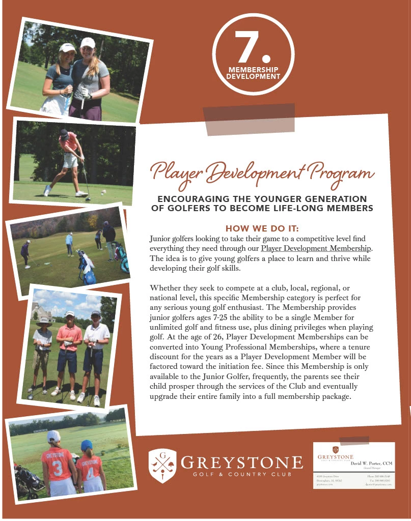 We offer a special rate and privileges to those 7-25. When they reach the age of 26, they may convert their membership to a regular golf membership with their player development years counted towards their initiation fee. This has been so popular that this membership classification is currently full with a waiting list to join.
