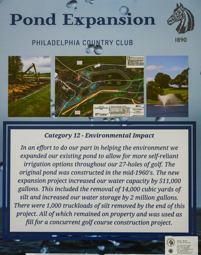 In an effort to do our part in helping the environment we expanded our existing pond to allow for more self-reliant irrigation options throughout our 27-holes of golf. The original pond was constructed in the mid-1960's. The new expansion project increased our water capacity by 511,000 gallons. This included the removal of 14,000 cubic yards of silt and increased our water storage by 2 million gallons. There were 1,000 truckloads of silt removed by the end of this project. All of which remained on property and was used as fill for a concurrent golf course construction project.