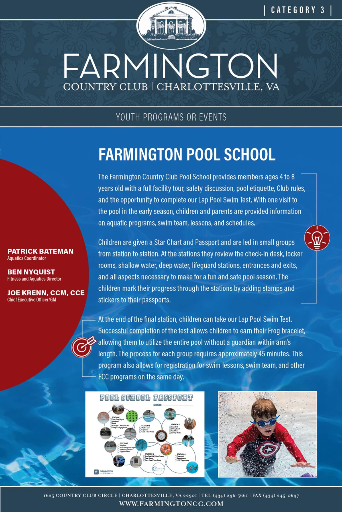 The Farmington Country Club Pool School provides members ages 4 to 8 years old with a full facility tour, safety discussion, pool etiquette, Club rules, and the opportunity to complete our Lap Pool Swim Test. With one visit to the pool in the early season, children and parents are provided information on aquatic programs, swim team, lessons, and schedules.